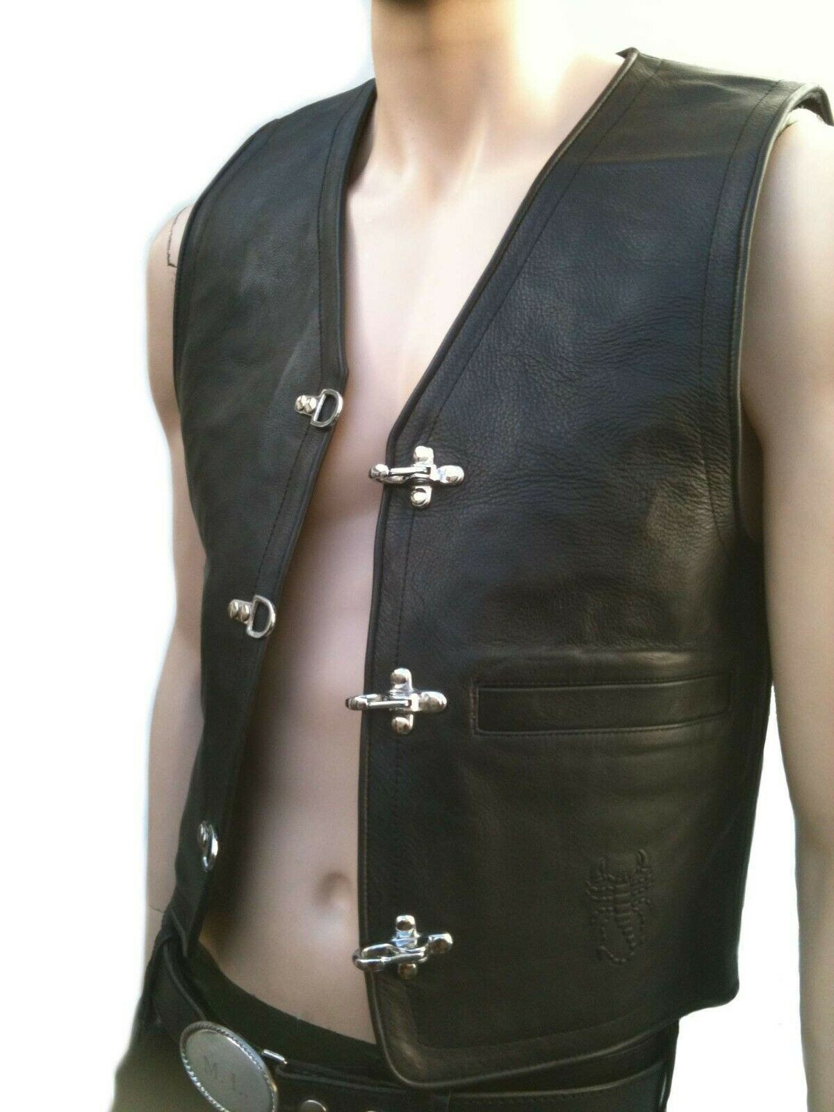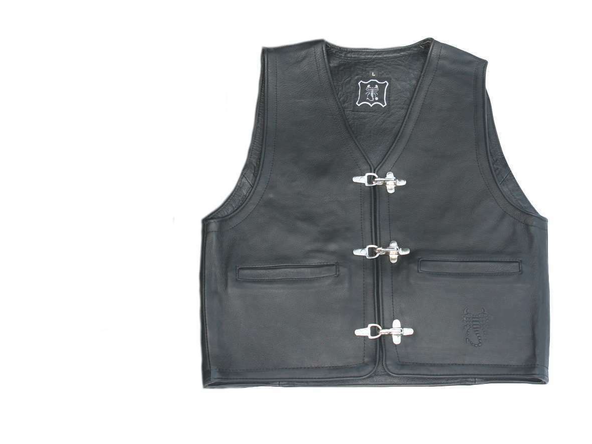 Lederweste Skorpion Piping schwarz Die Alternative zur Club-Lederkutte, Skorpion Lederweste Piping aus hochwertigem und robustem Rindnappaleder. Die markanten und stabilen Metallhaken prägen den Look dieser Weste, die beiden Außentaschen sowie die 2 Innentaschen mit Reißverschlüssen bieten genügend