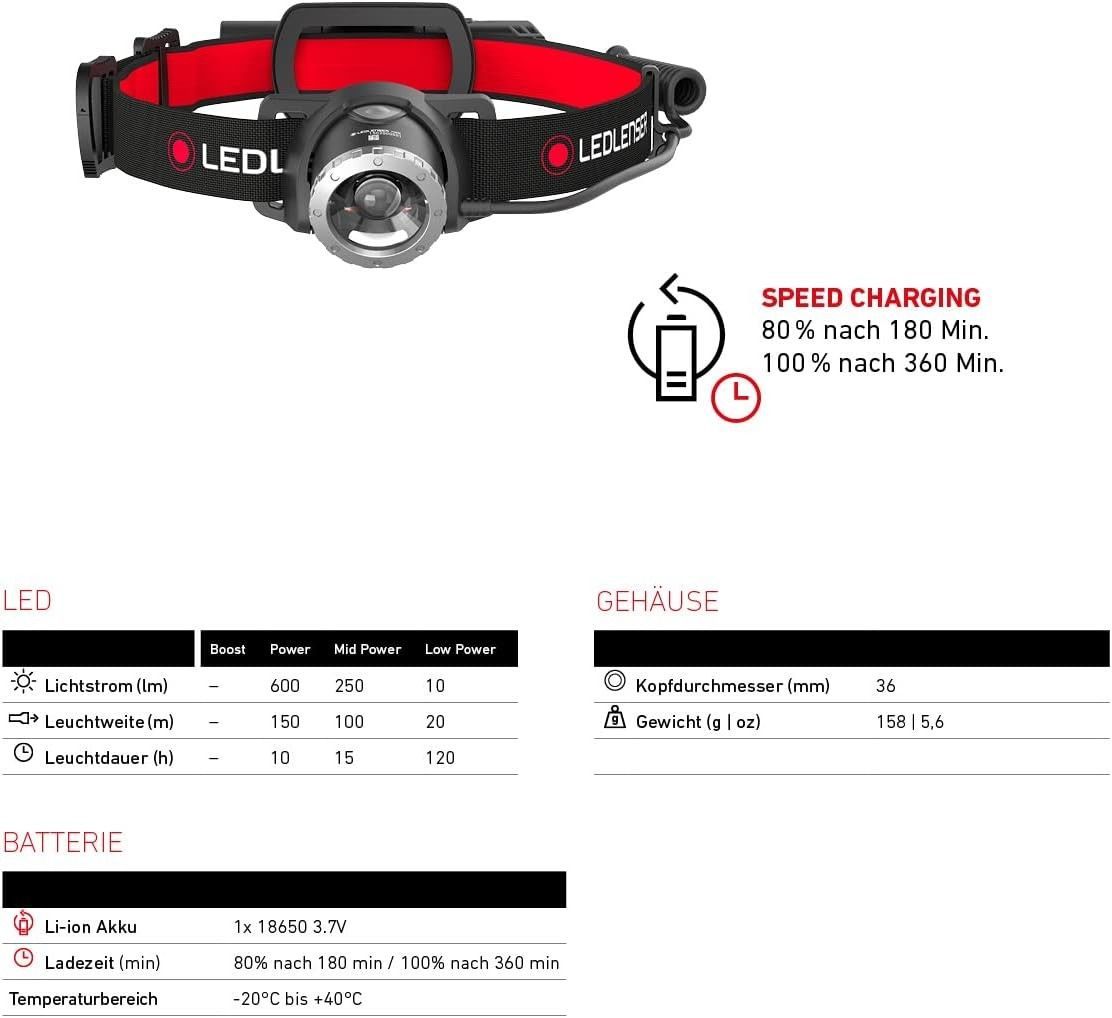 Ledlenser H8R LED Kopf-Stirnlampe 600 Lumen 120h Akku Récklicht USB IPX 4