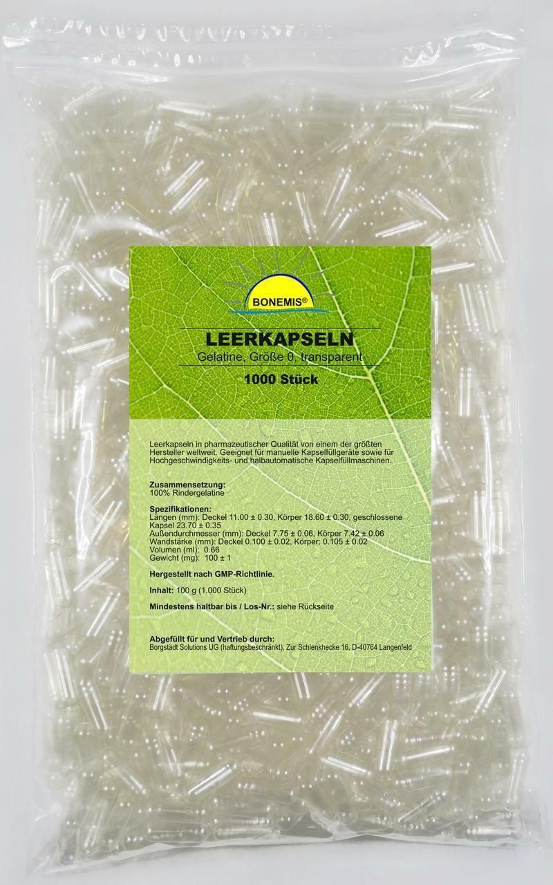 Leerkapseln, 1000 Stück, Größe 0, transparent, Rindergelatine, Pharmaqualität