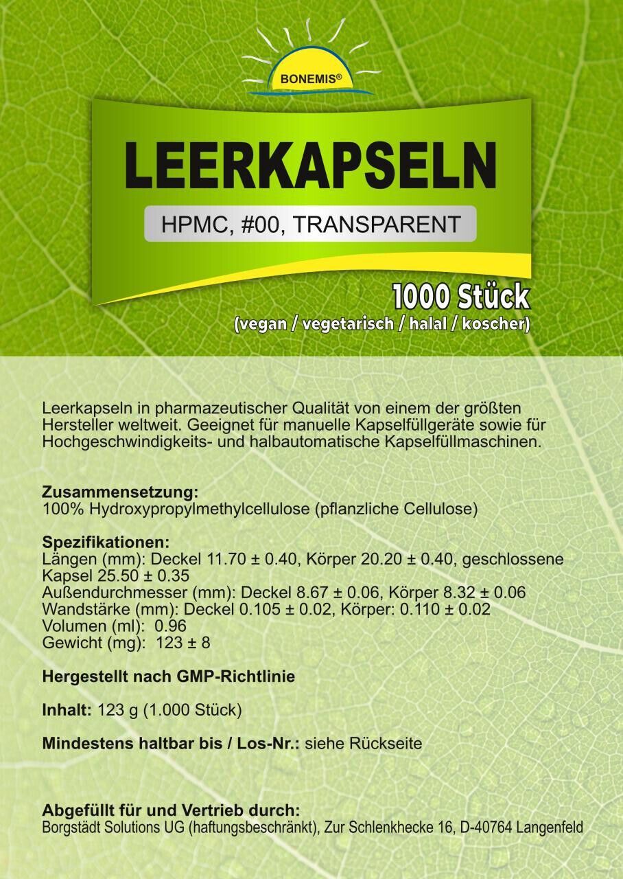 Leerkapseln, 1000 Stück, Größe 00, transparent, HPMC (vegan), Pharmaqualität