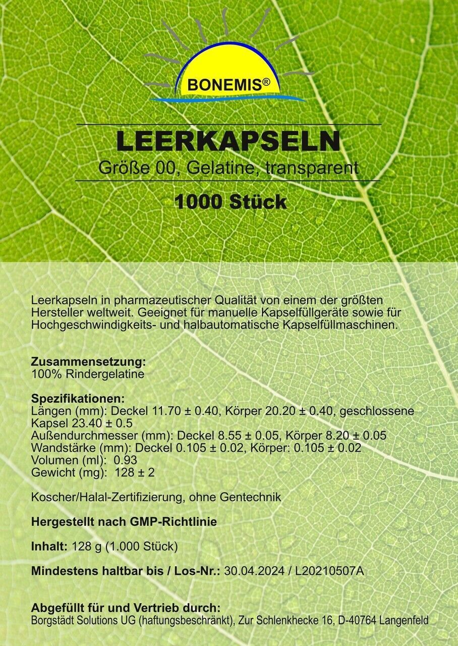 Leerkapseln, 1000 Stück, Größe 00, transparent, Rindergelatine, Pharmaqualität