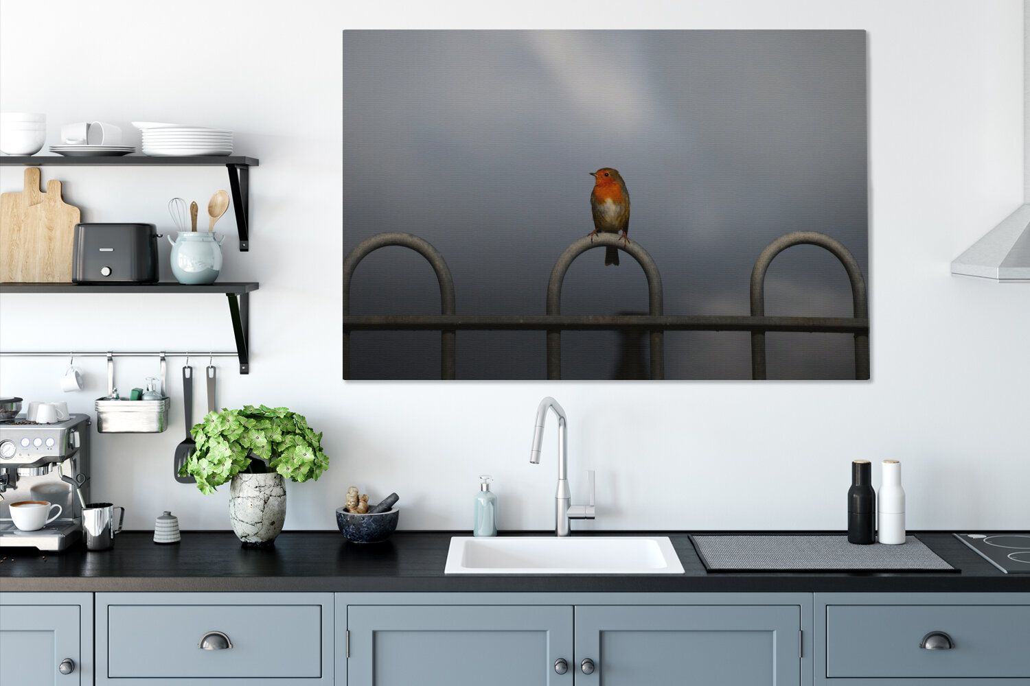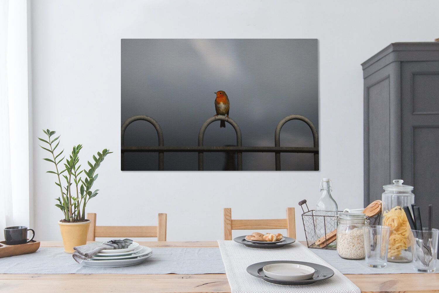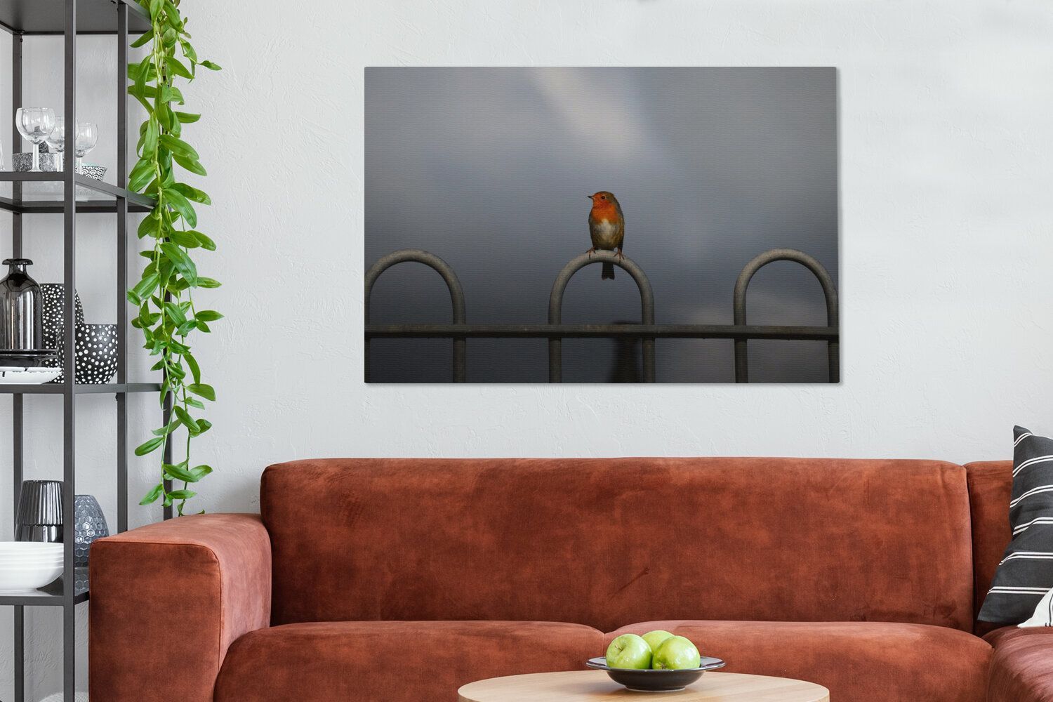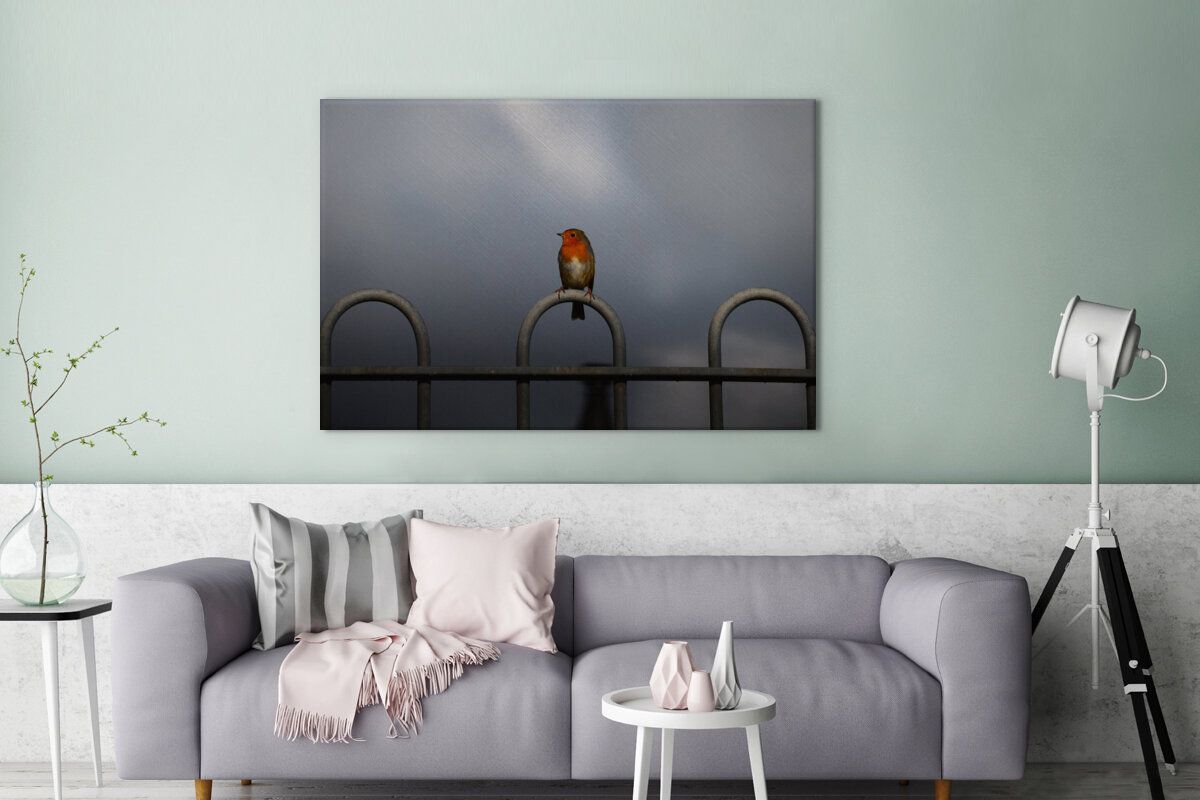 Leinwandbilder - 120x80 cm - Rotkehlchen - Vogel - Zaun (Gr. 120x80 cm)