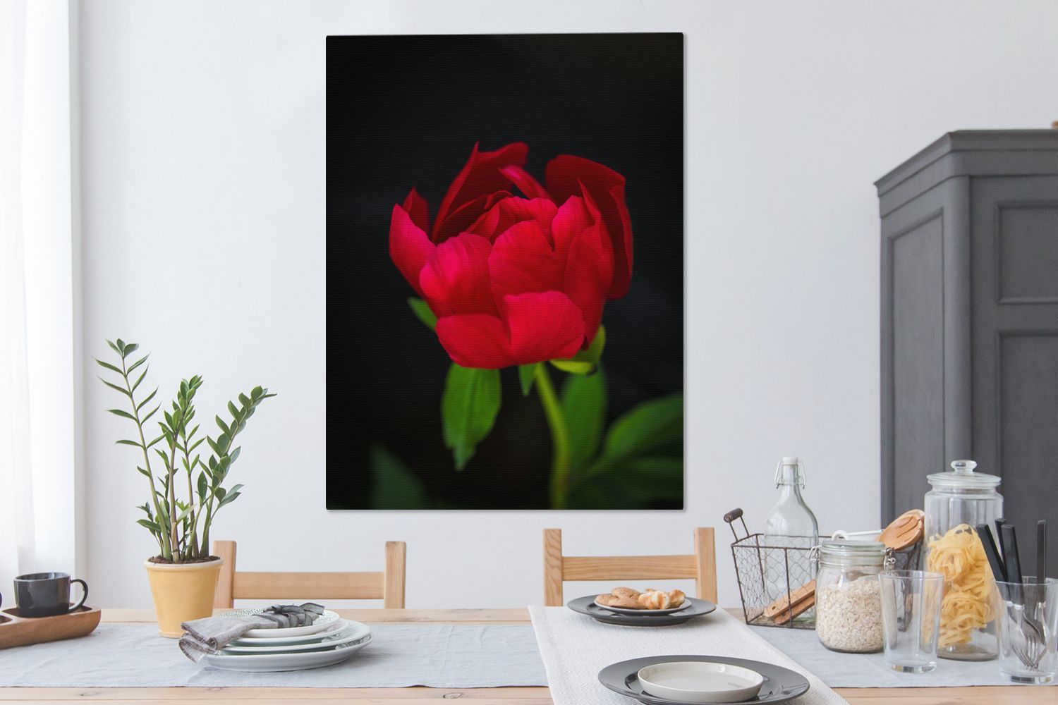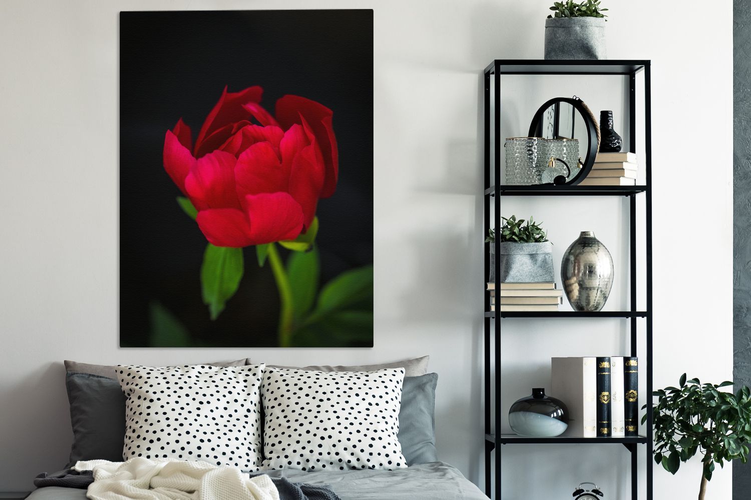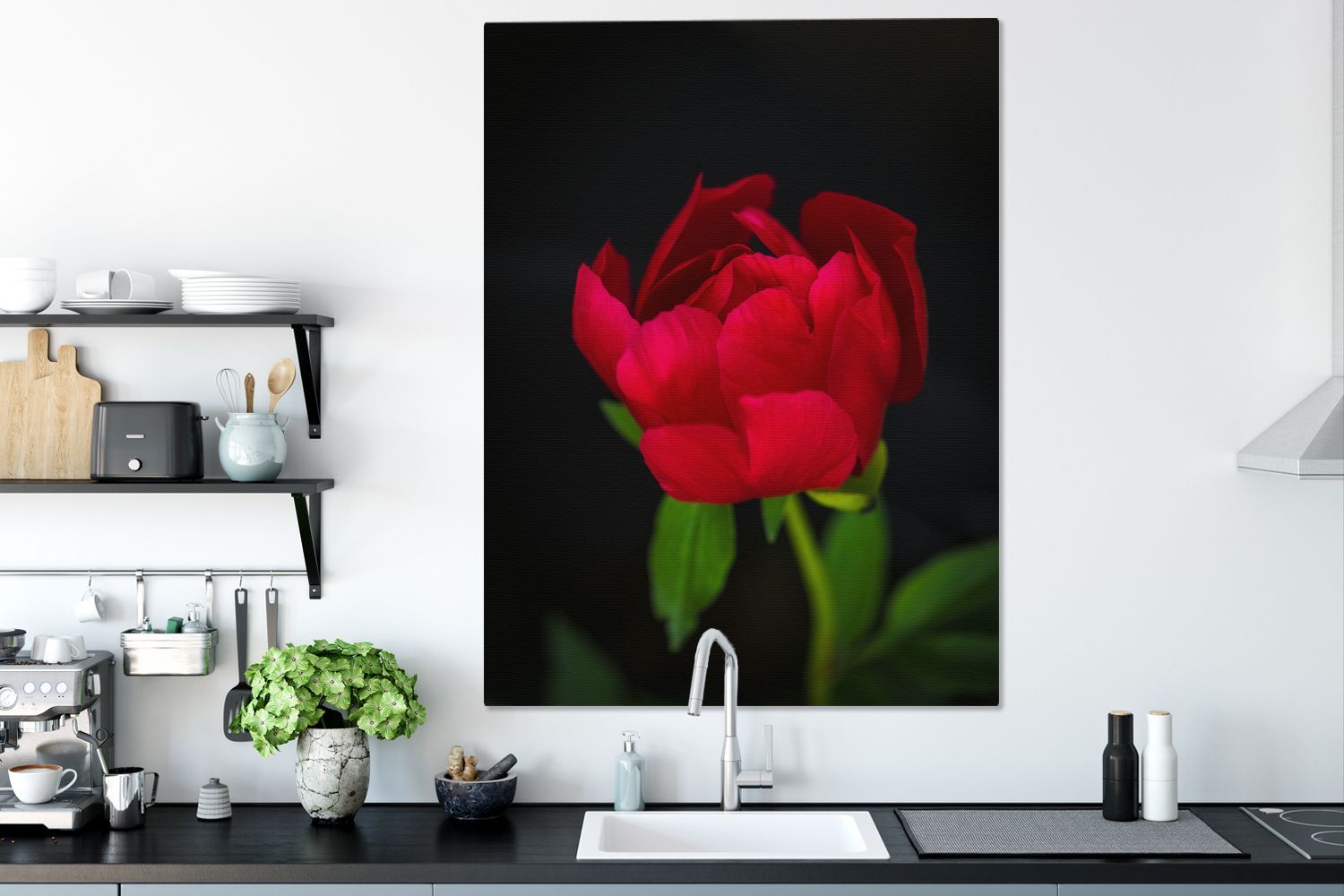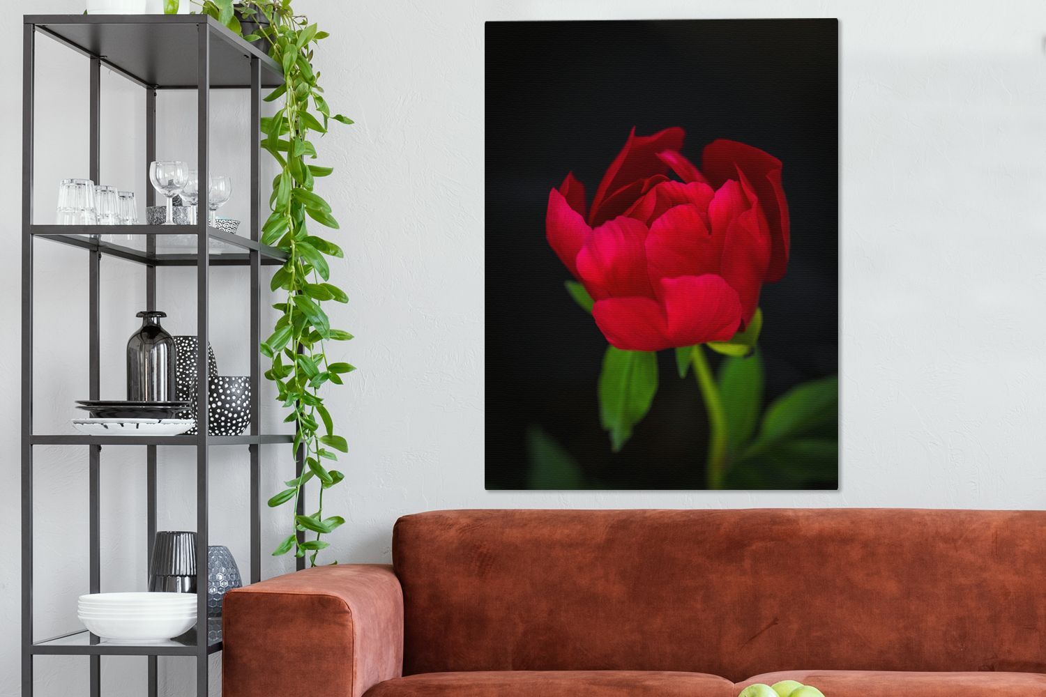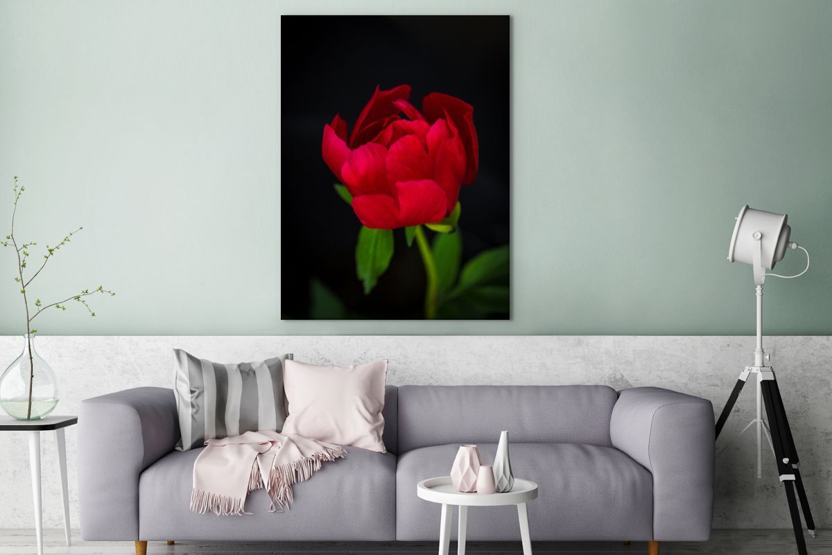 Leinwandbilder - 90x120 cm - Eine Knospe einer roten Pfingstrose mit schwarzem Hinter