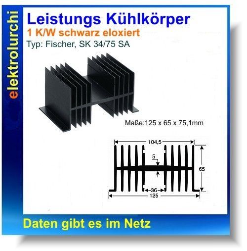 Sie bieten hier auf folgenden Artikel NEU 1 Stück Leistungs Kühlkörper 1 K W (L x B x H) 75 x 125 x 65mm Fischer SK 34 75 SA Wärmewiderstand liegt bei 1.1 K W Aluminium schwarz eloxiert Lieferung: ohne Transistor