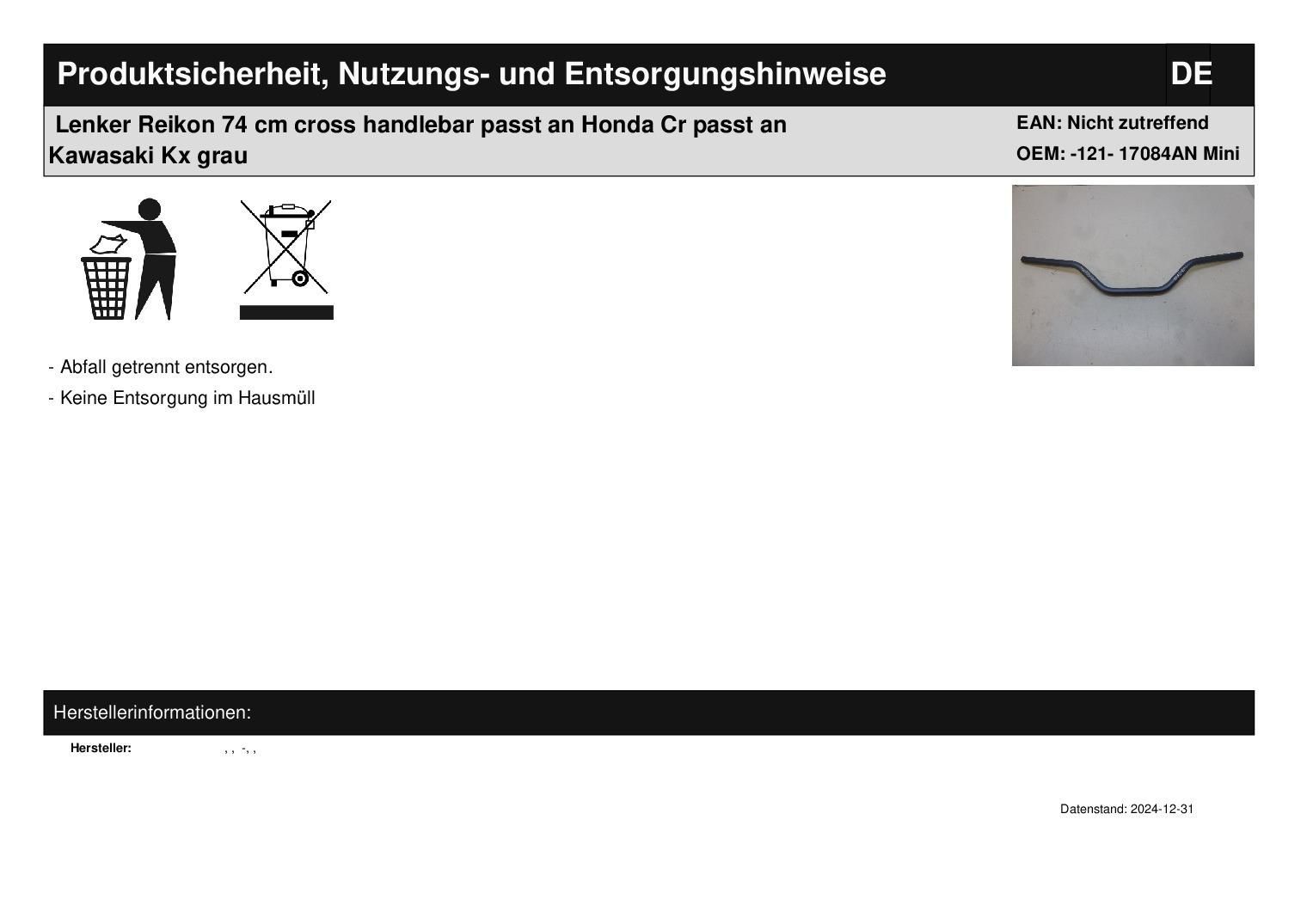 Lenker Reikon 74 cm cross handlebar passt an Honda Cr passt an Kawasaki Kx grau In dieser Auktion gibt es folgenden Artikel zu kaufen: Lenker (siehe Foto) Modell: universal Lenkerbreite: ca. 74 cm Lieferumfang: siehe Foto Artikelzustand: neu aus Geschäftsauflösung, mit leichten Lagerspuren; Zustand
