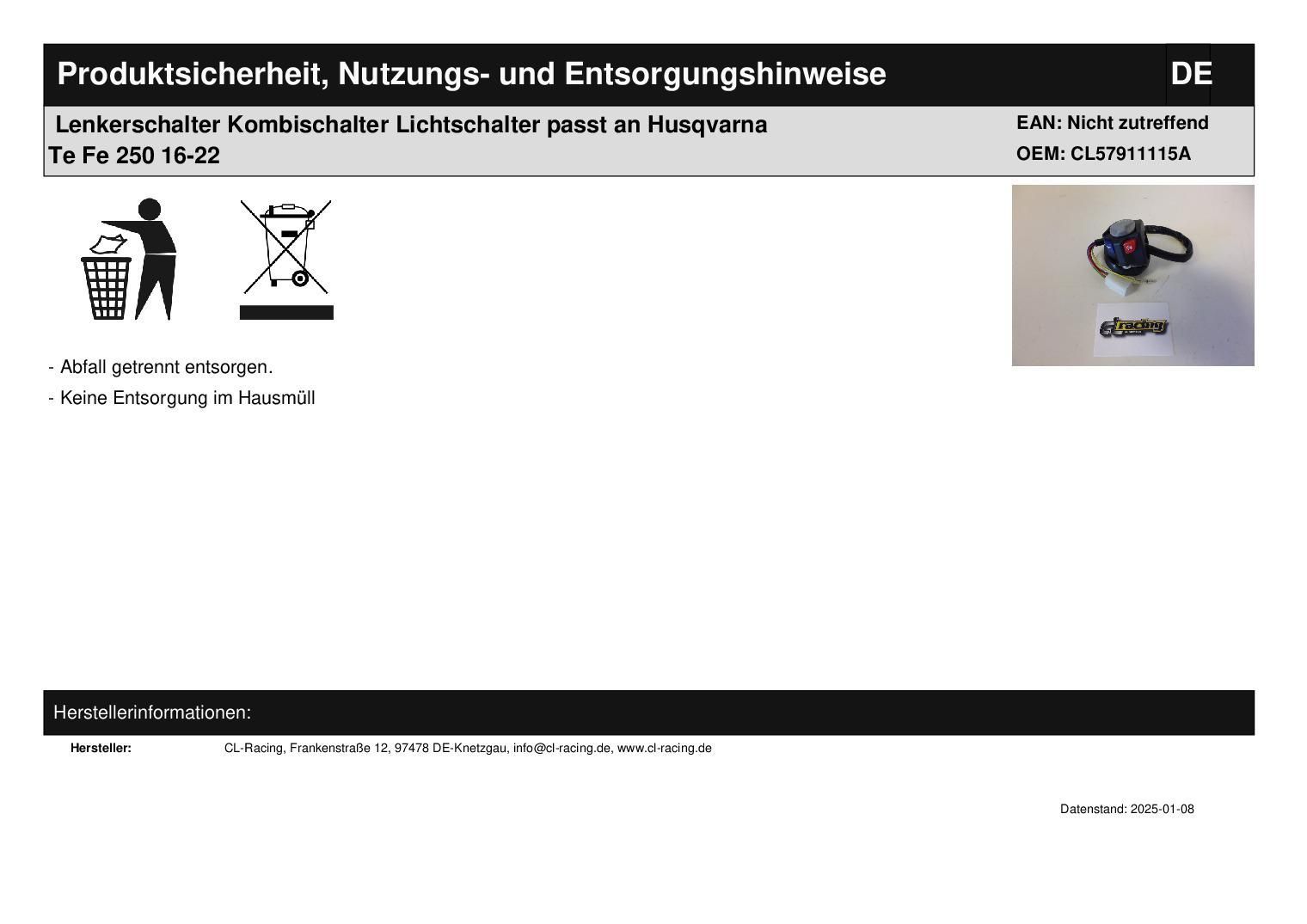 Lenkerschalter Kombischalter Lichtschalter passt an Husqvarna Te Fe 250 16-22
