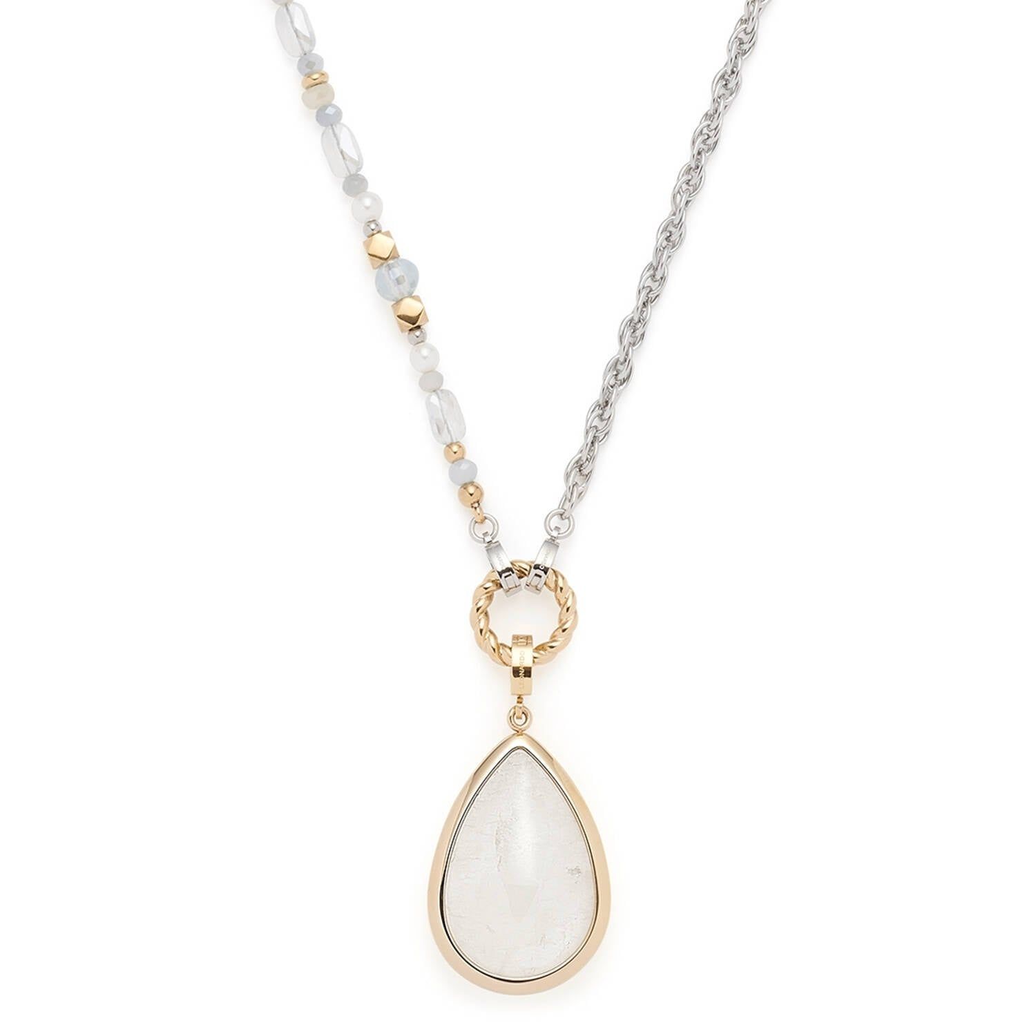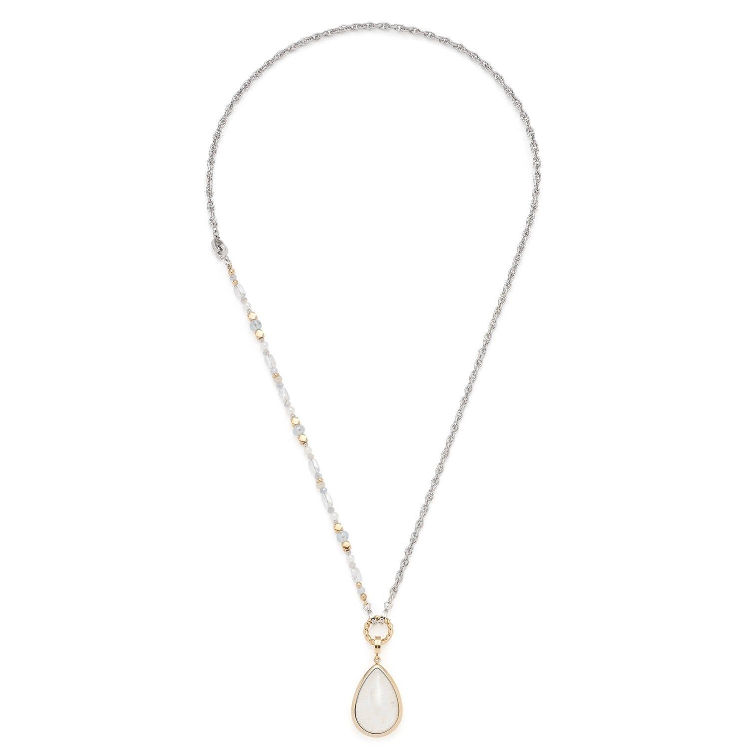 schicke Halskette aus poliertem Edelstahl 316L, teils gold ionen-plattiert, kann entweder mit dem Armband als langes oder ohne das Armband als kurzes Collier getragen werden, passend für Clip & Mix Anhänger, Zopfkette kombiniert mit facettierten Glasperlen in Blau- und Grautönen, Hämatit, goldfarbenen Elementen und weißen Imitationsperlen, gold plattierter Edelstahlring, Durchmesser 14 mm, Gesamtlänge 69 cm, tropfenförmiger Anhänger mit schimmerndem Bergkristall, Größe 45 x 23,5 mm, polierte