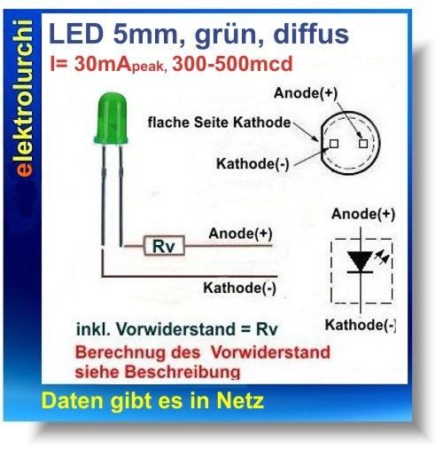 Leuchtdiode / LED, bedrahtet, grün, Ø 5mm, diffus, 300-500mcd, 10St.