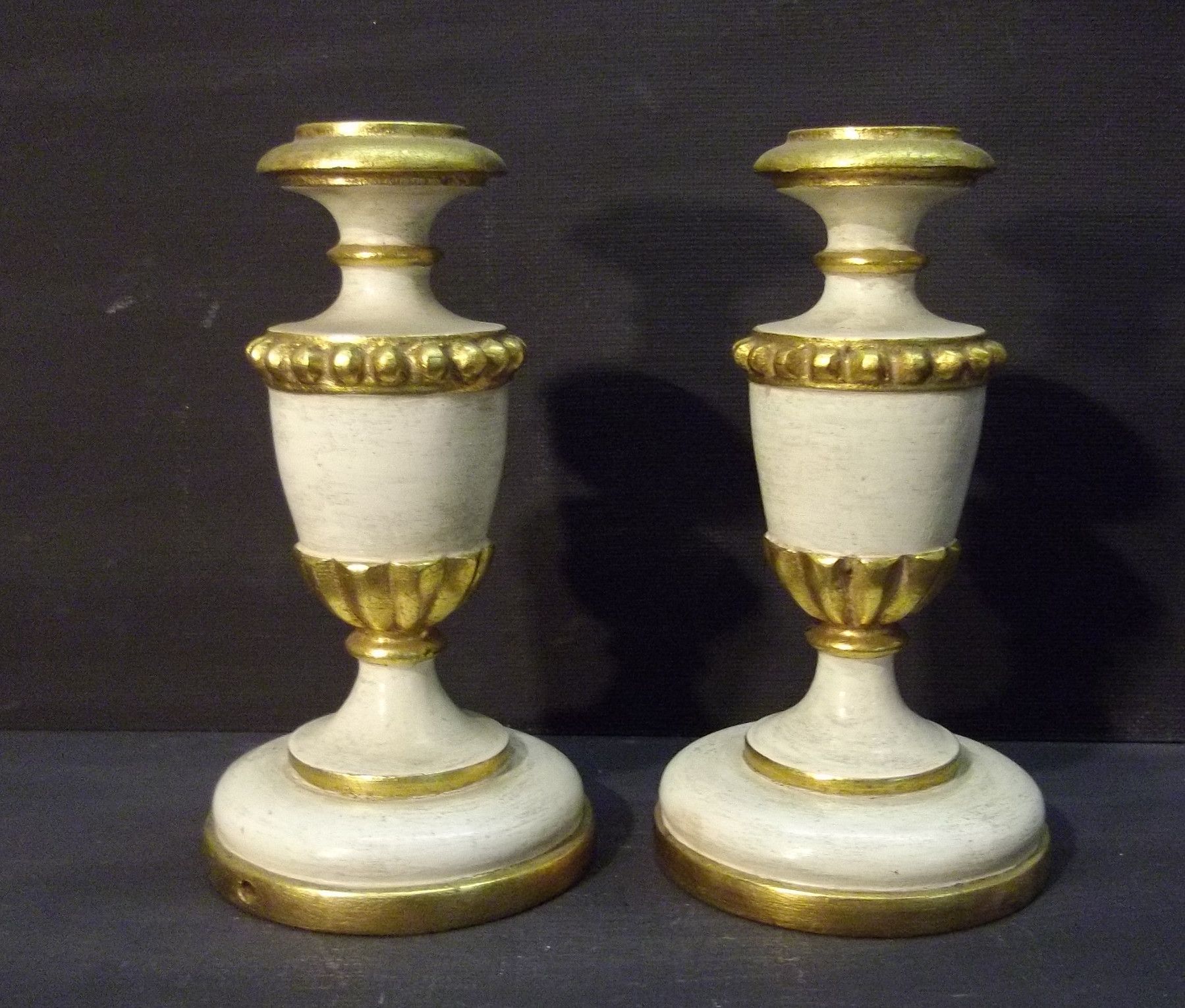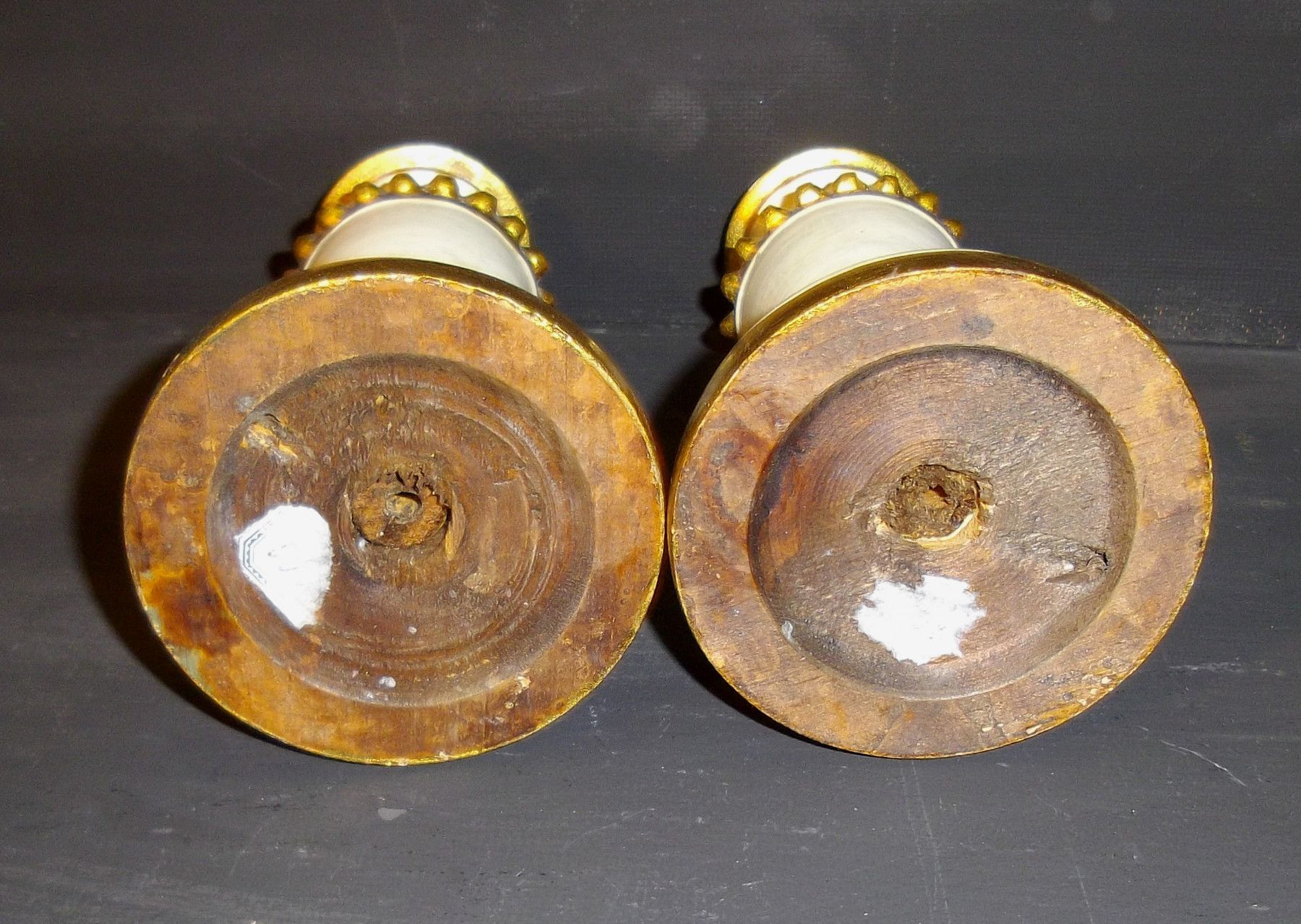 Kerzen-Leuchterpaar um 1900. Holz, farbig gefasst. Maße: H 17, Ø Kerze 1,5 cm. Gut erhalten! Antikes am Deich - Inh: Oliver Kipp-Trense