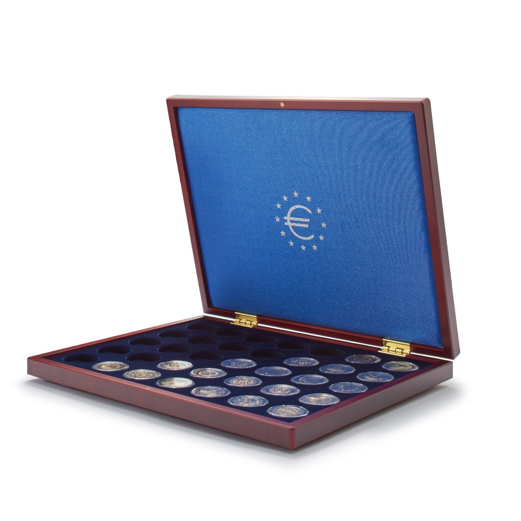 Leuchtturm 323638 Volterra Uno - Münzkassette für 35 x 2 Euro Münzen in Kapseln Die Münzkassette Volterra Uno de Luxe bietet eine elegante Lösung zur Aufbewahrung Ihrer 2-Euro-Münzen in Kapseln. Diese hochwertige Kassette beeindruckt mit einer mahagonifarbenen Holzmaserung und einem Deckelkissen aus