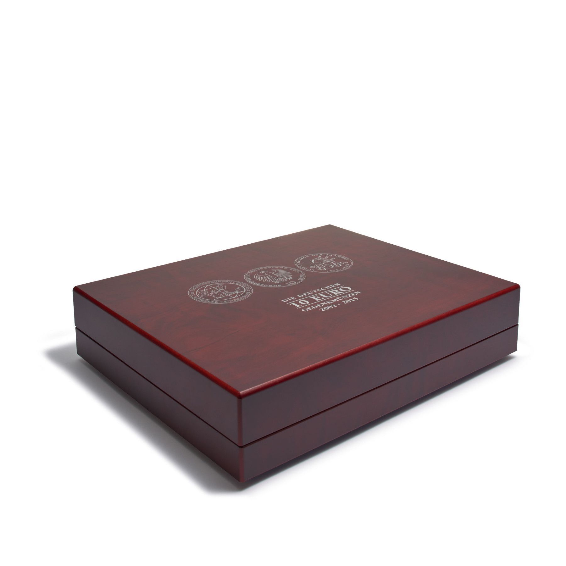 Leuchtturm 349906 Volterra Quattro - Münzkassette für 104 dt. 10 Euro Gedenkmünzen in Kapseln Diese hochwertige Münzkassette in edler, mahagonifarbener Holzmaserung bietet Platz für alle 104 deutschen 10-Euro- Gedenkmünzen (Stempelglanz) in Kapseln (InnenØ 32,5 mm). Inkl. 4 Einlagen mit blaue