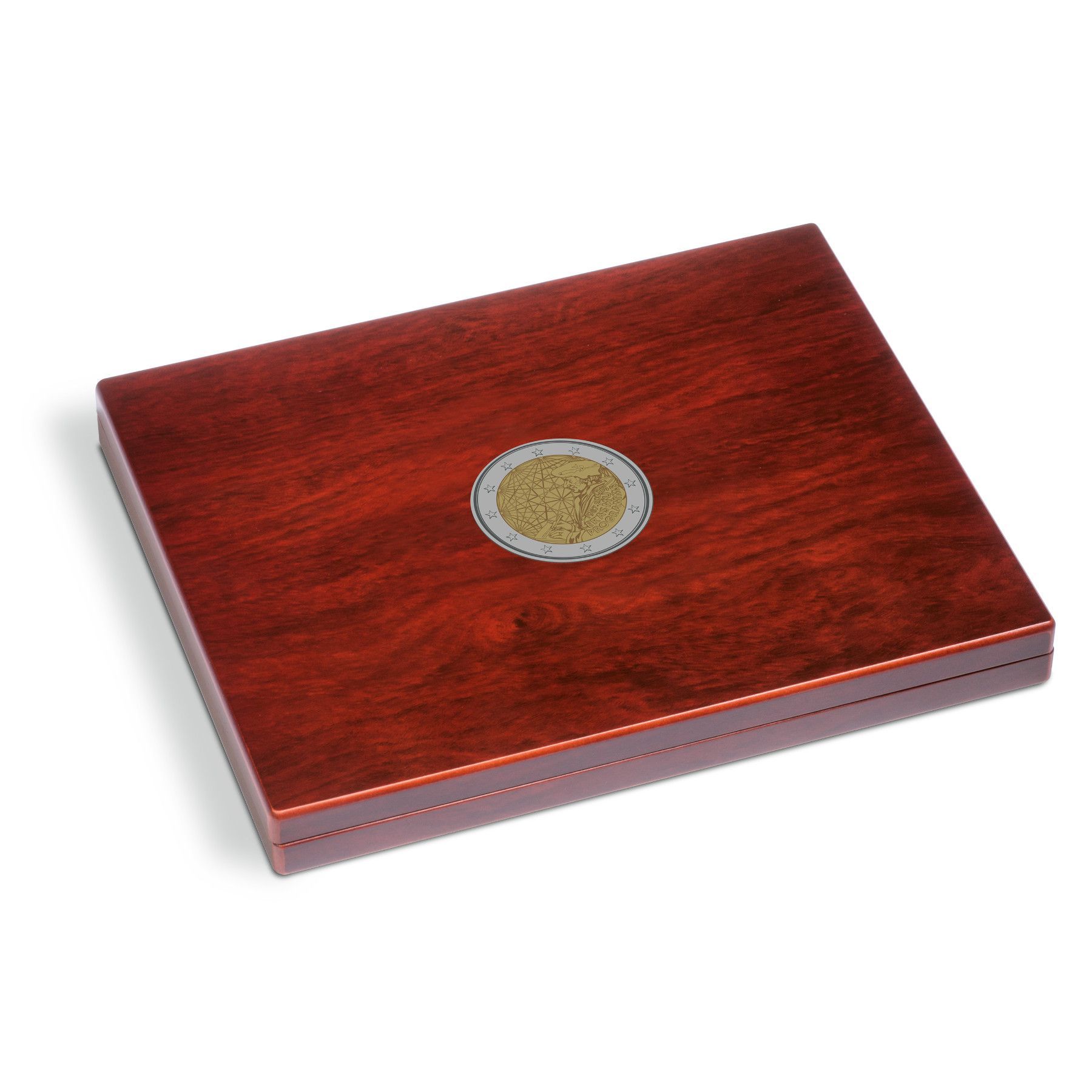 Leuchtturm 365454 Volterra Uno - Münzkassette für 23 x 2 Euro 2022 Erasmus in Kapseln Diese hochwertige, mahagonifarbene Münzkassette bietet Platz für alle 23 2-Euro-Münzen der Gemeinschaftsausgabe 2022 35 Jahre Erasmus-Programm in Kapseln, einschließlich der fünf deutschen Prägestätten (A, D, F, G,