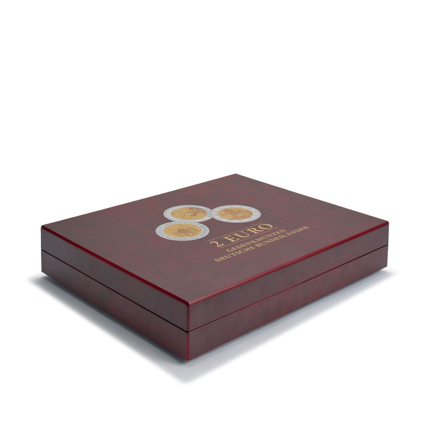 Leuchtturm 367919 Volterra Trio - Münzkassette für 2 Euro-Gedenkmünzen Deutsche Bundesländer Hochwertige Münzkassette VOLTERRA TRIO de Luxe in mahagonifarbener Holzmaserung für alle 80 2-Euro-Gedenkmünzen der Serie Deutsche Bundesländer in Kapseln. 3 Einlagen mit veloursartiger Oberfläche. Die Kasse