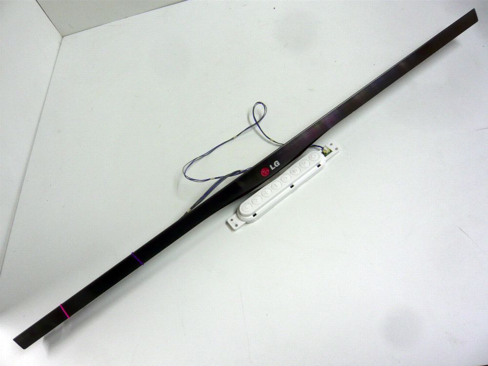 gebraucht, funktionstüchtig komplette untere Frontleiste mit IR Empfänger und Bedienteil Modul, sowie Verbindungskabel für LG LCD TV Typ: 32LA6678 Gesamtlänge: 715mm Farbe: antrazith Material: Alu gebürstet Versand DHL Rolle Regal