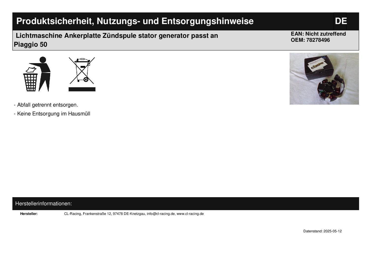 Lichtmaschine Ankerplatte Zündspule stator generator passt an Piaggio 50 In dieser Auktion gibt es folgenden Artikel zu kaufen: Lichtmaschine (siehe Foto) Modell: passend für Piaggio 50 Bj.: unbekannt Lieferumfang: siehe Foto Artikelzustand: neu aus Geschäftsauflösung, mit leichten Lagerspuren; Zust