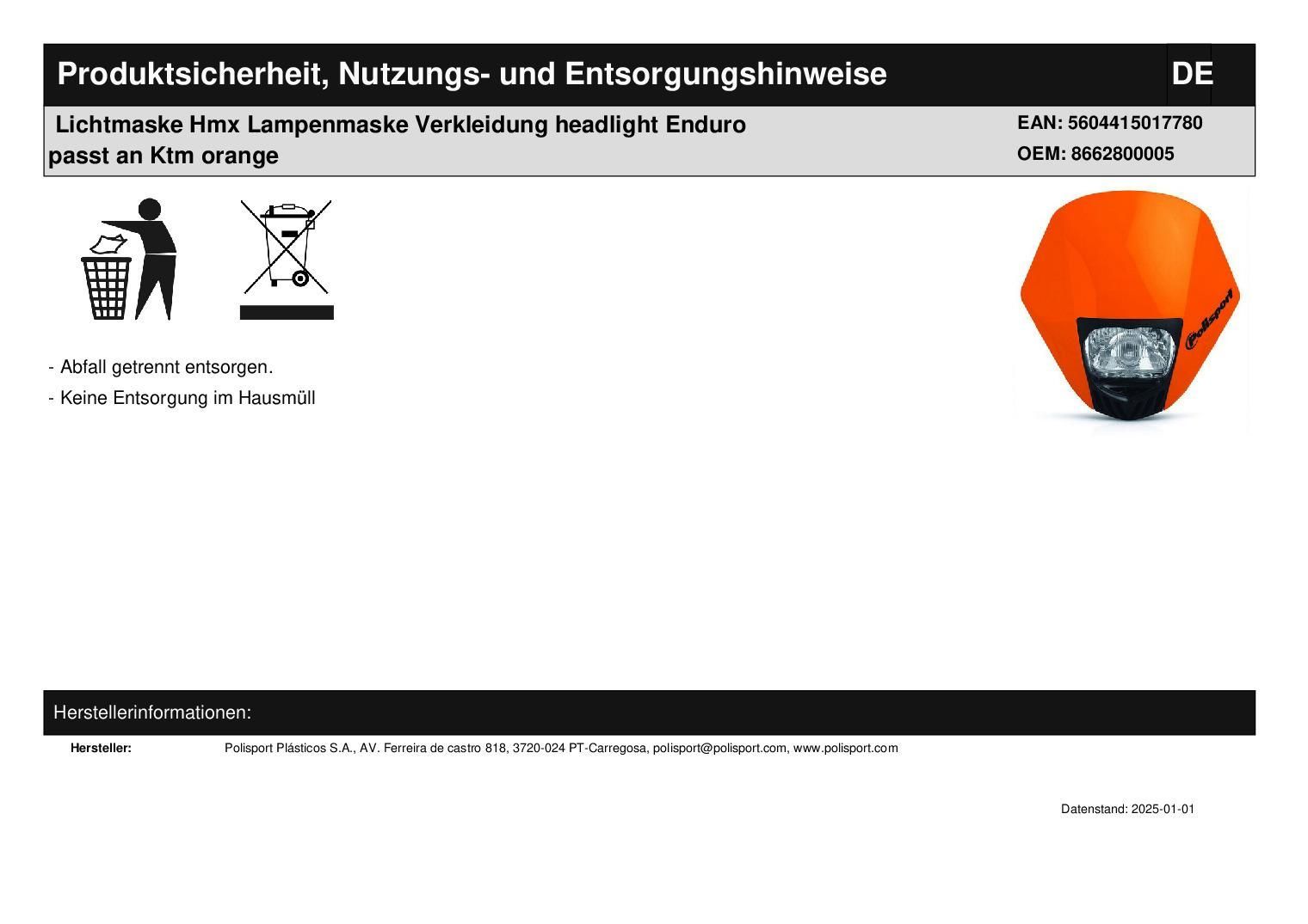 Polisport Lichtmaske Hmx Lampenmaske Verkleidung headlight Enduro passt an Ktm orange