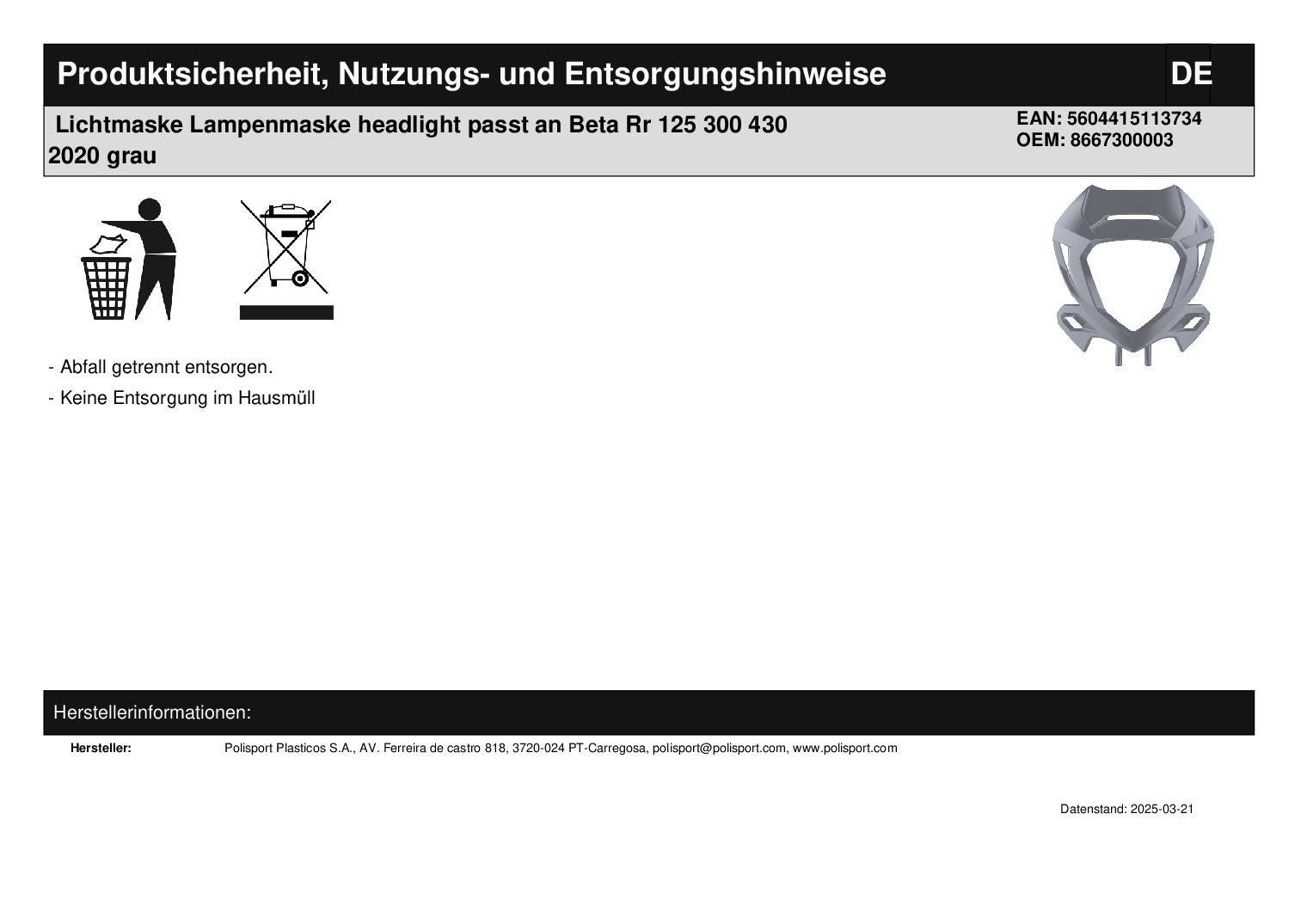 Polisport Lichtmaske Lampenmaske headlight passt an Beta Rr 125 300 430 2020 grau