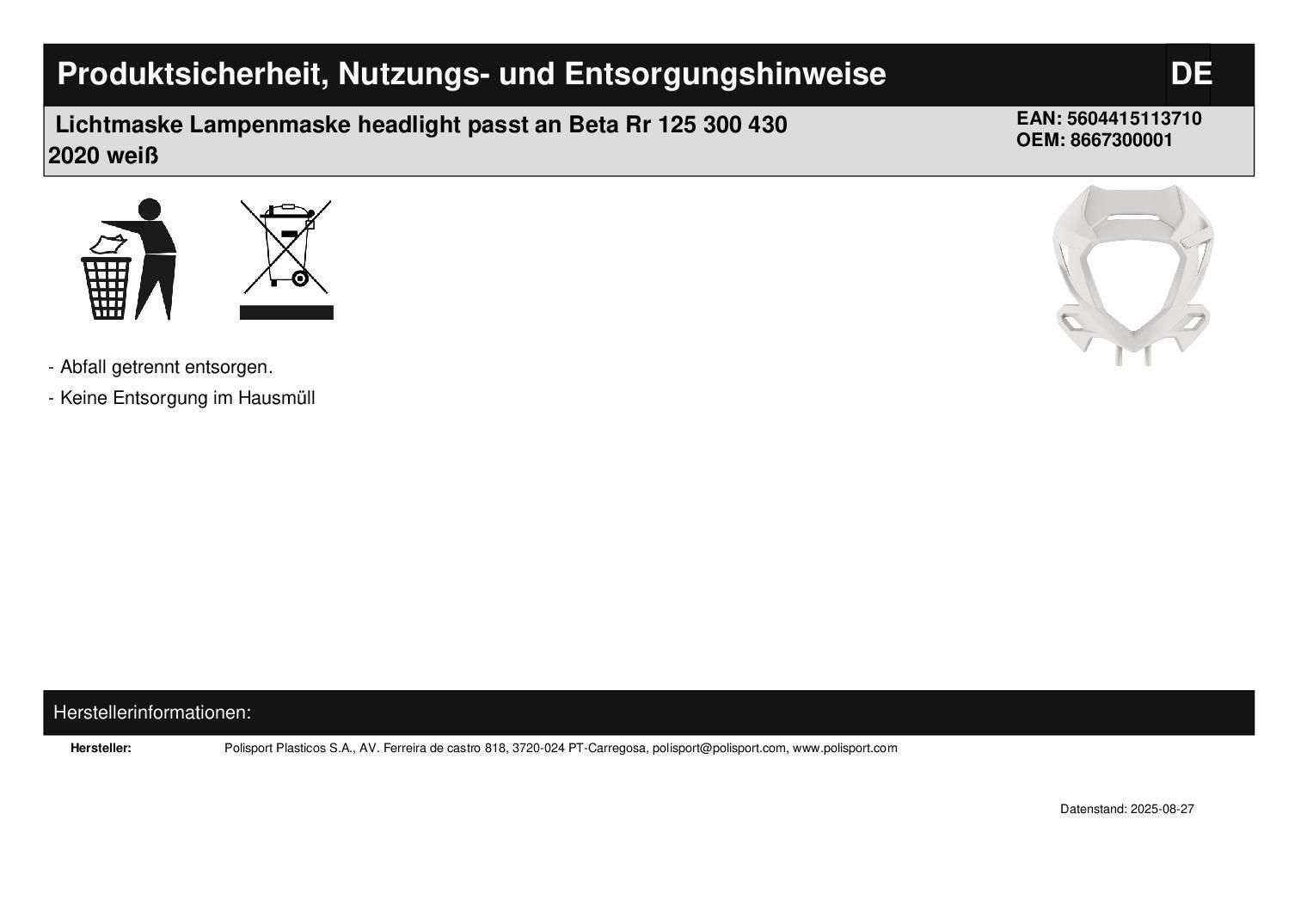 Polisport Lichtmaske Lampenmaske headlight passt an Beta Rr 125 300 430 2020 weiß