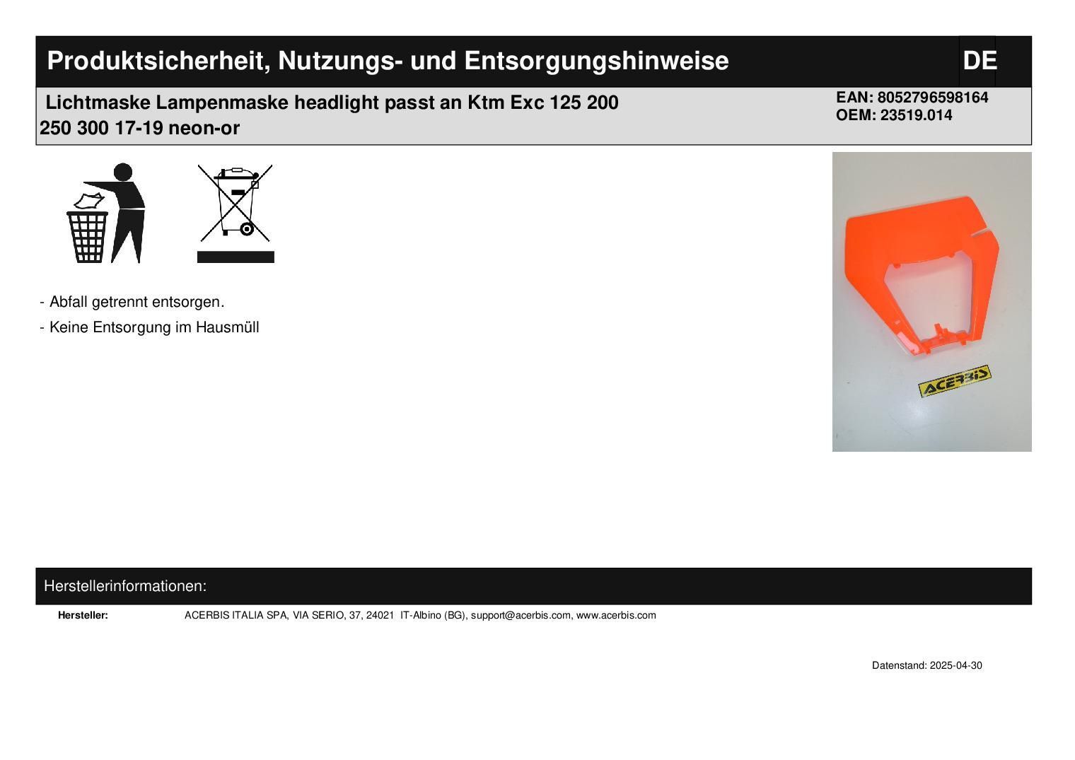 Acerbis Lichtmaske Lampenmaske headlight passt an Ktm Exc 125 200 250 300 17-19 neon-or