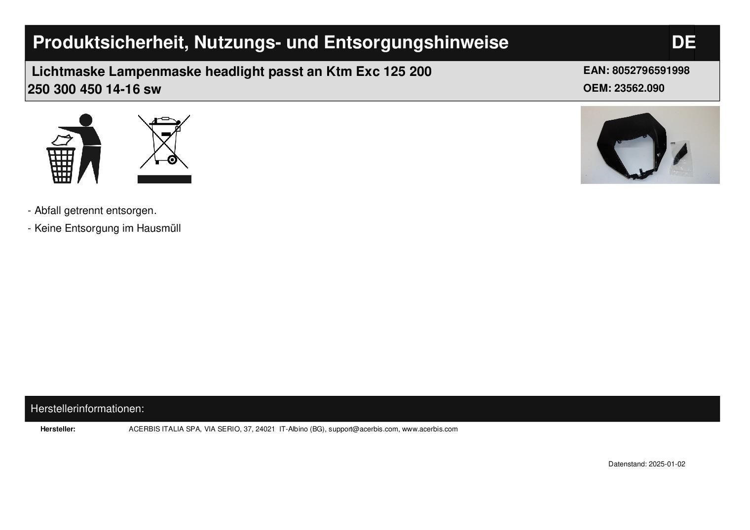 Acerbis Lichtmaske Lampenmaske headlight passt an Ktm Exc 125 200 250 300 450 14-16 sw