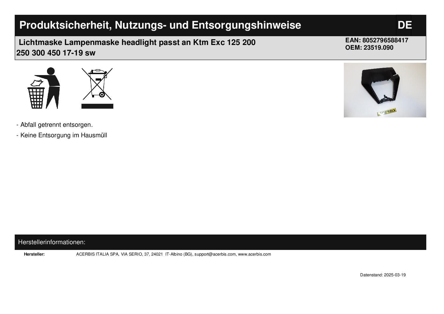 Acerbis Lichtmaske Lampenmaske headlight passt an Ktm Exc 125 200 250 300 450 17-19 sw