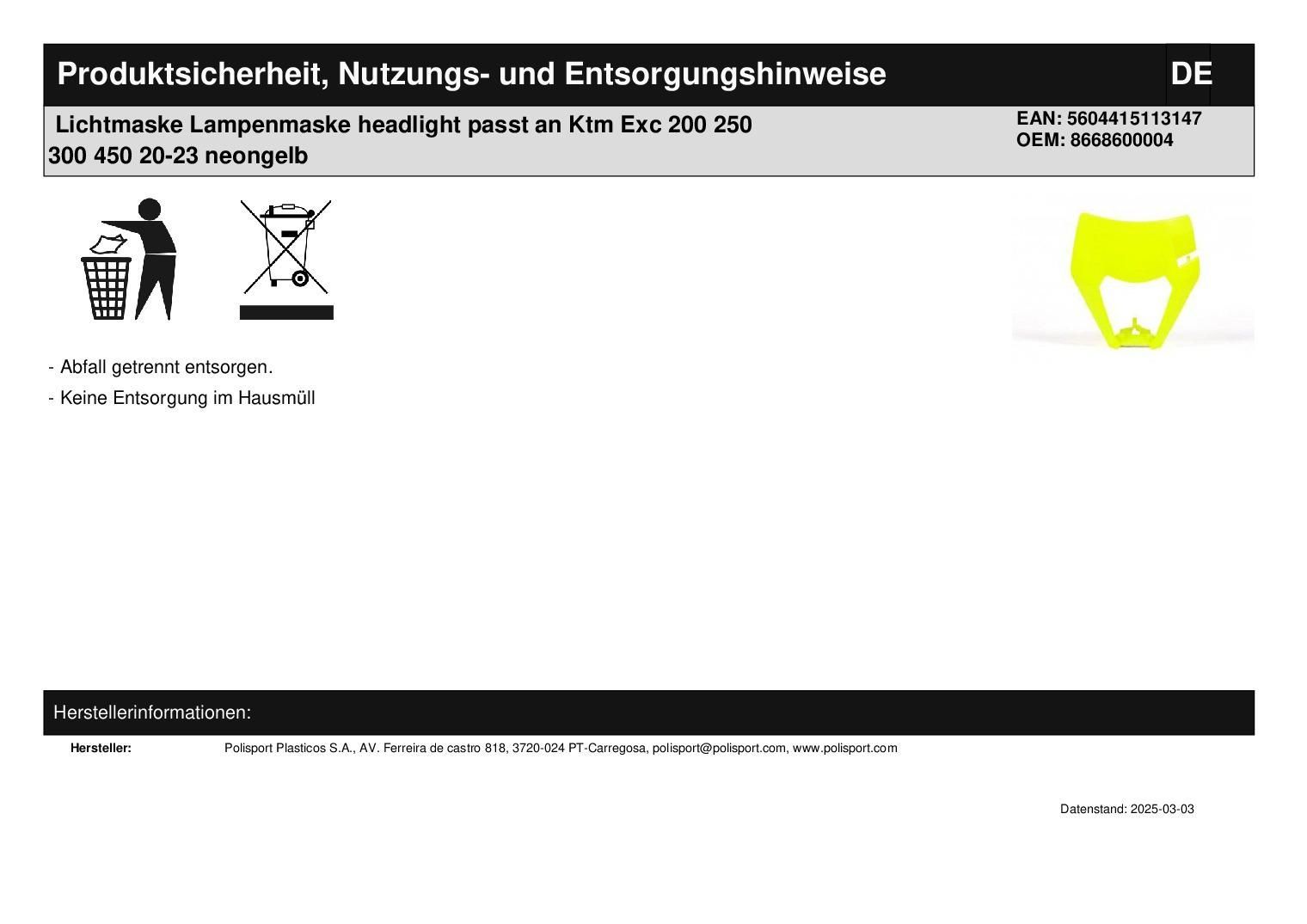 Polisport Lichtmaske Lampenmaske headlight passt an Ktm Exc 200 250 300 450 20-23 neongelb