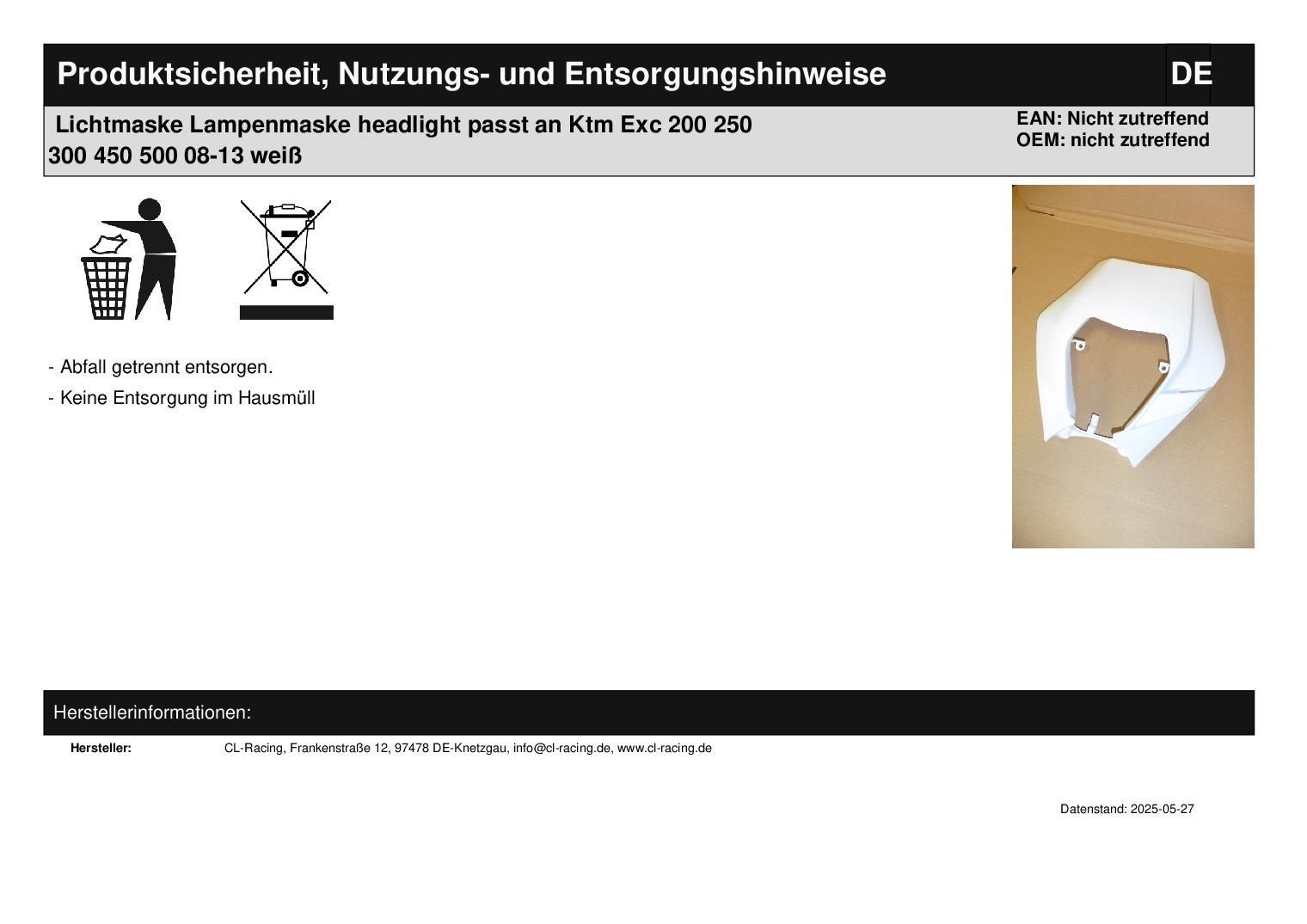 Lichtmaske Lampenmaske headlight passt an Ktm Exc 200 250 300 450 500 08-13 weiß