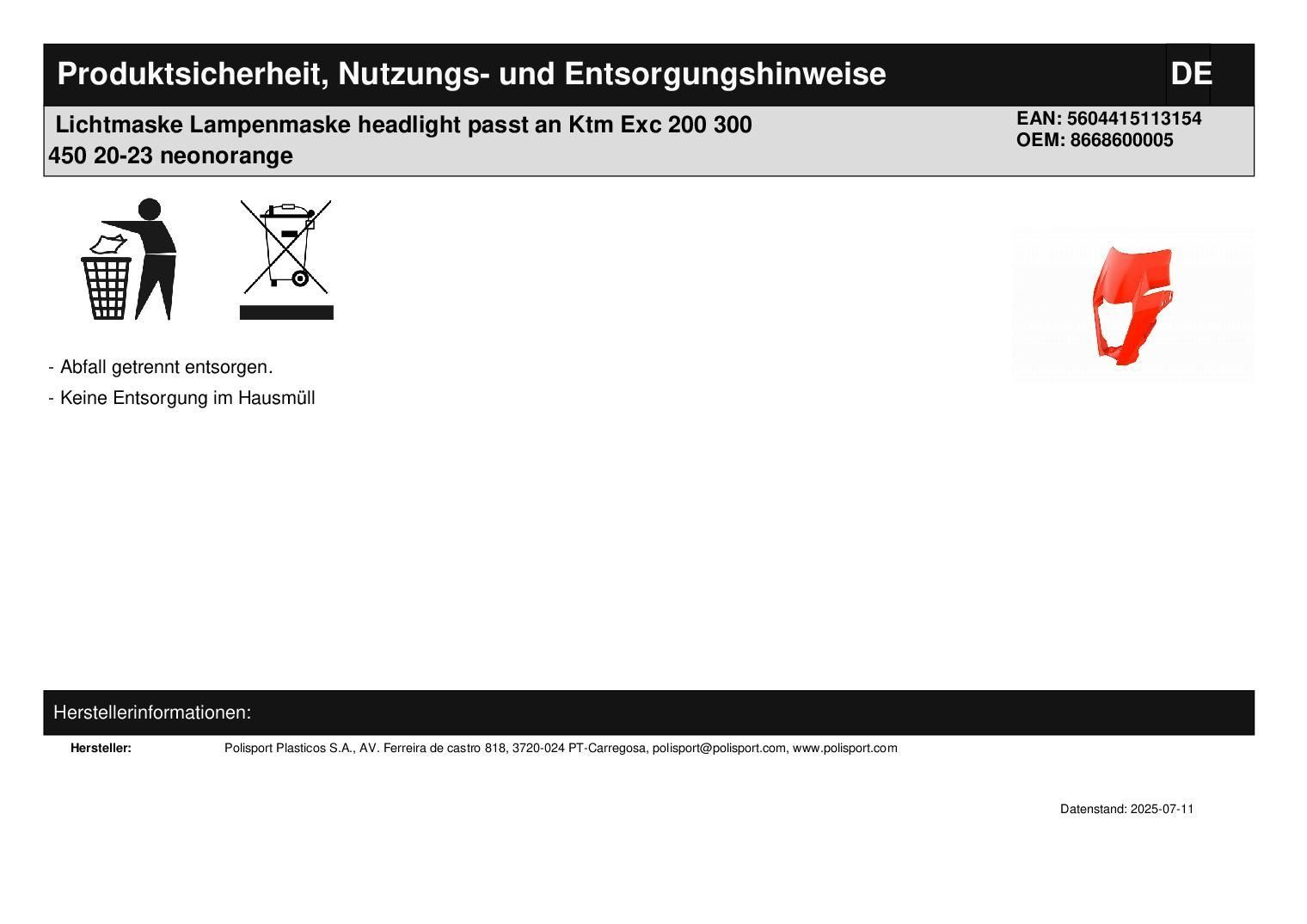 Polisport Lichtmaske Lampenmaske headlight passt an Ktm Exc 200 300 450 20-23 neonorange