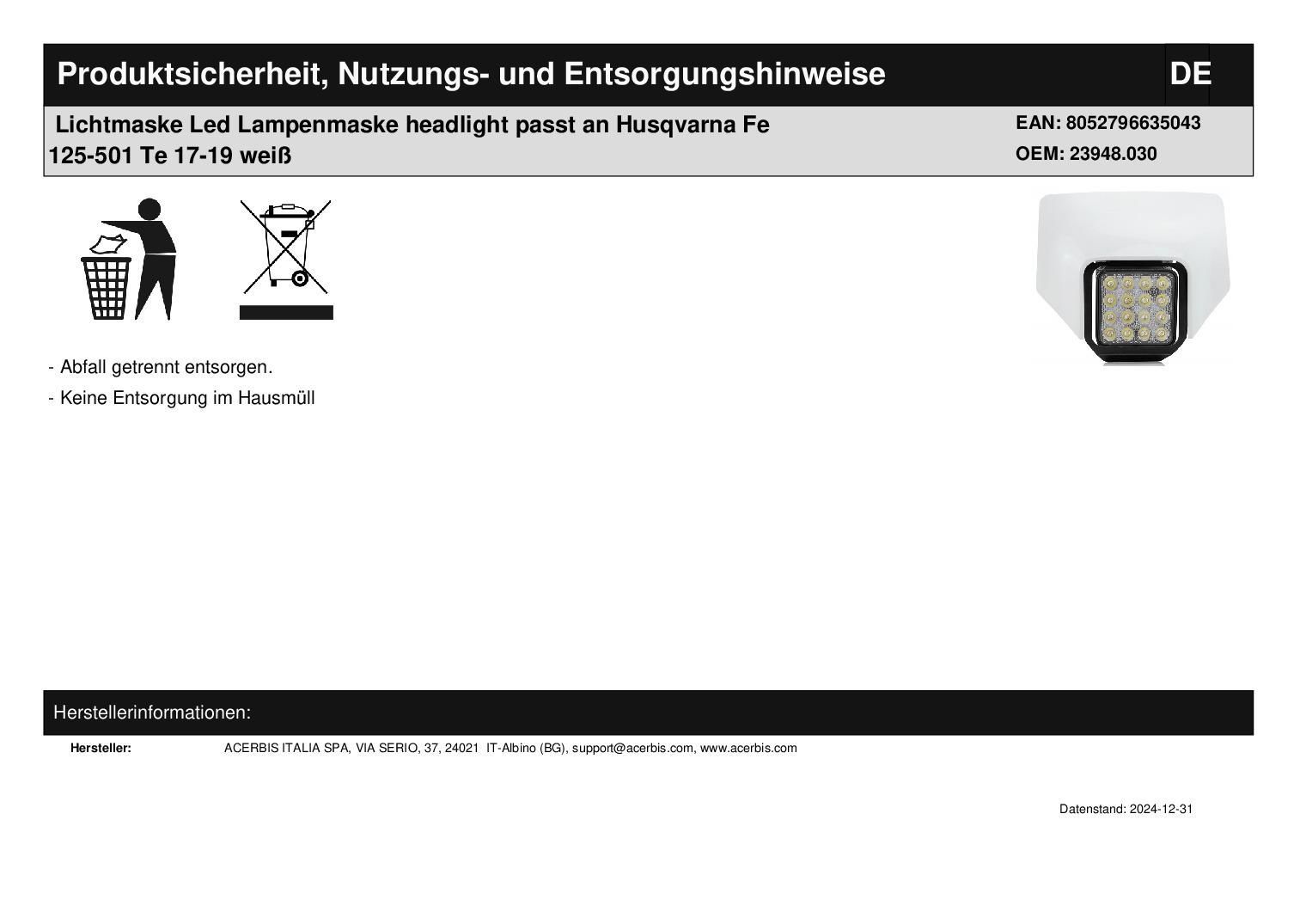 Acerbis Lichtmaske Led Lampenmaske headlight passt an Husqvarna Fe 125-501 Te 17-19 weiß
