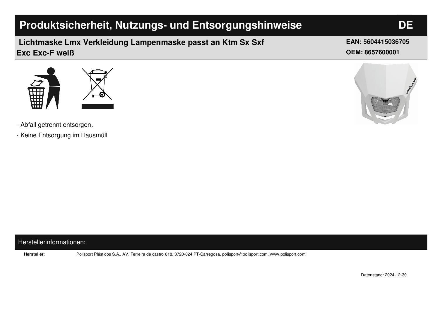 Polisport Lichtmaske Lmx Verkleidung Lampenmaske passt an Ktm Sx Sxf Exc Exc-F weiß