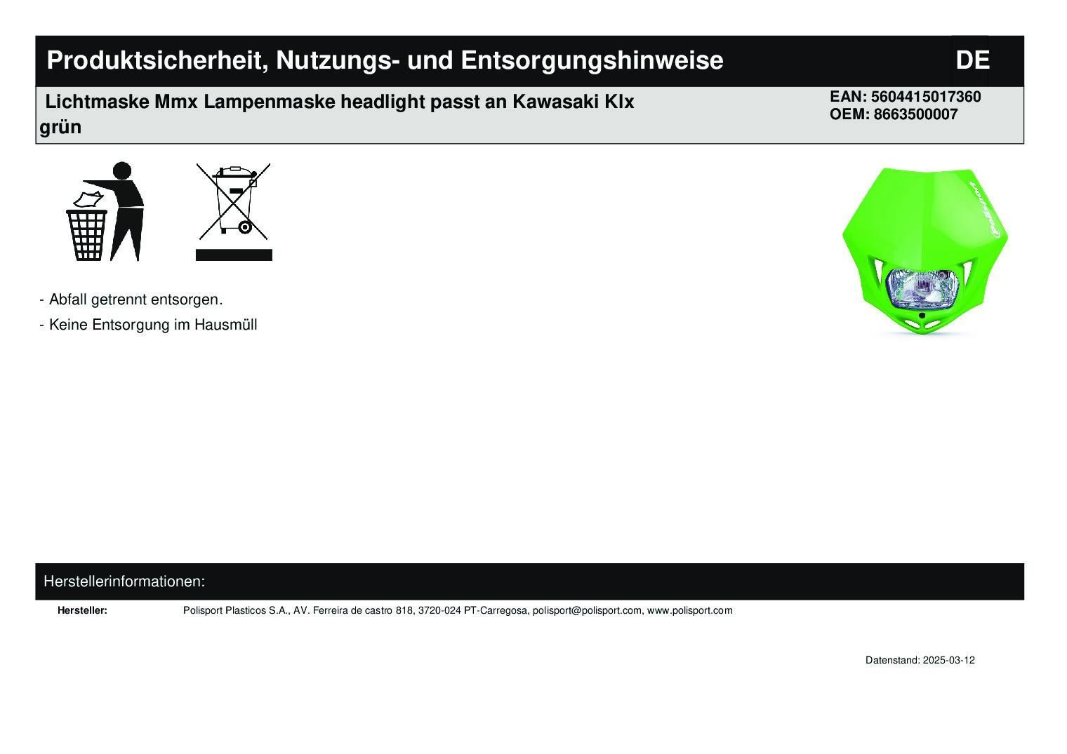 Polisport Lichtmaske Mmx Lampenmaske headlight passt an Kawasaki Klx grün