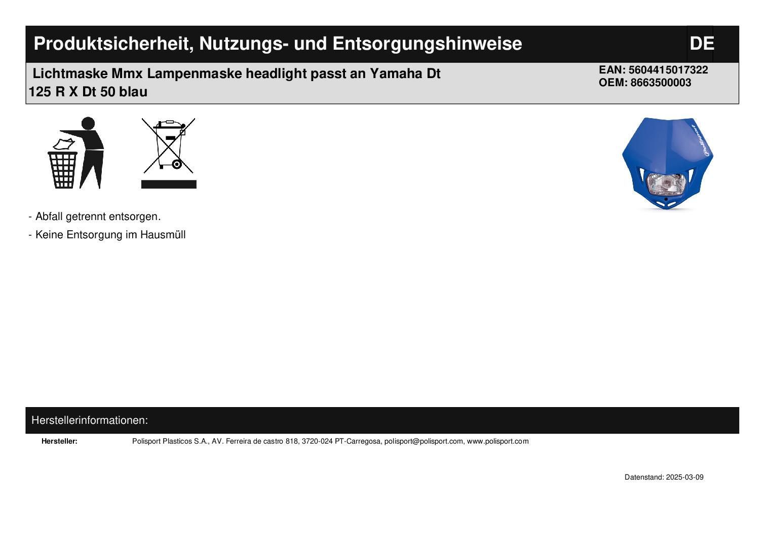 Polisport Lichtmaske Mmx Lampenmaske headlight passt an Yamaha Dt 125 R X Dt 50 blau