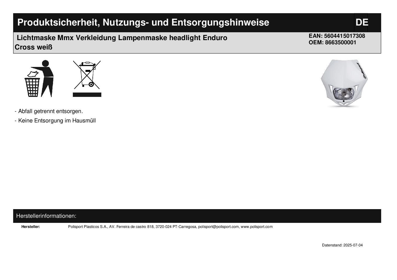 Polisport Lichtmaske Mmx Verkleidung Lampenmaske headlight Enduro Cross wei?