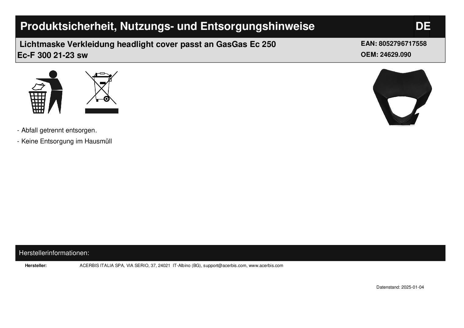 Acerbis Lichtmaske Verkleidung headlight cover passt an GasGas Ec 250 Ec-F 300 21-23 sw