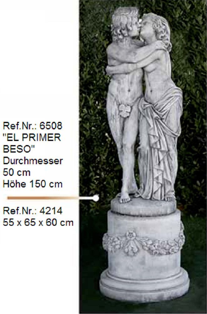 Ein wunderschönes Liebespaar „EL PRIMER BESO“ ( der erste Kuss ) als Gartenskulptur, die jedes Anwesen oder Terrasse einen mediterranen Touch verleiht. Der antike Guss besteht aus Witterung - und frostbeständigem Weißstein und wird in aufwendiger Handarbeit in Andalusien hergestellt. Die abgebildete Figur steht auf einen Sockel mit der Ref.Nr. 4214, der nicht im Preis und Lieferumfang enthalten ist, kann aber auf Anfrage bestellt werden.