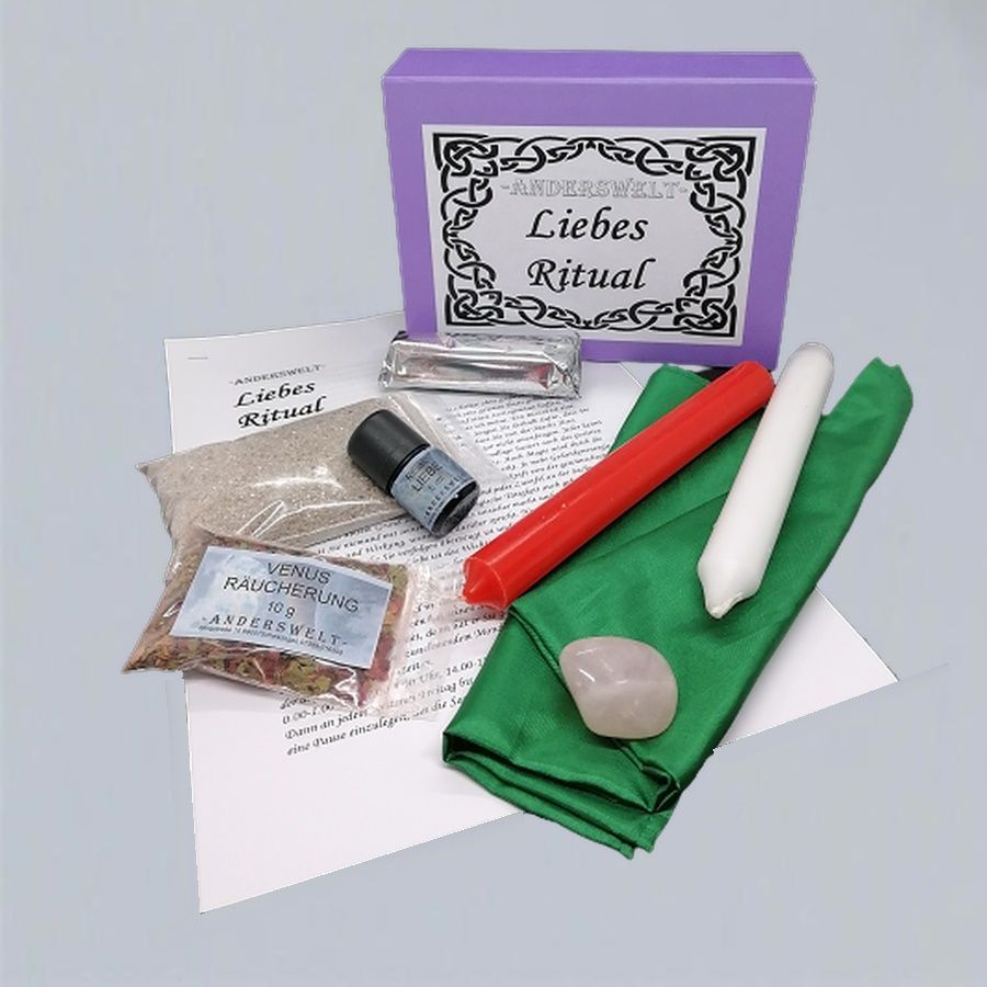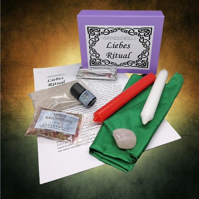 Liebesritual um den Seelenpartner anzuziehen, bestehend aus Ritualöl mit reinen ätherischen Ölen, magischer Räucherung, zwei durchgefärbten Kerzen, passendem Heilstein, der entsprechend geladen ist, Räucherkohle und ausführlicher Ritualbeschreibung.