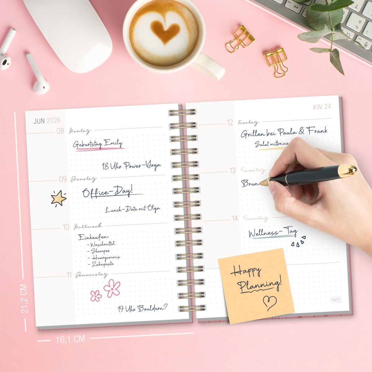Good vibes only! Der Lieblings-Timer 2025 2026 von Häfft glänzt durch ein angenehmes Design, das die Termine und Ideen in den Vordergrund stellt und so zu einem unverwechselbaren Begleiter wird - nachhaltig & klimafreundlich. Wochenplaner 2025 2026 Laufzeit: August 2025 – Dezember 2026 Format: A5 (m