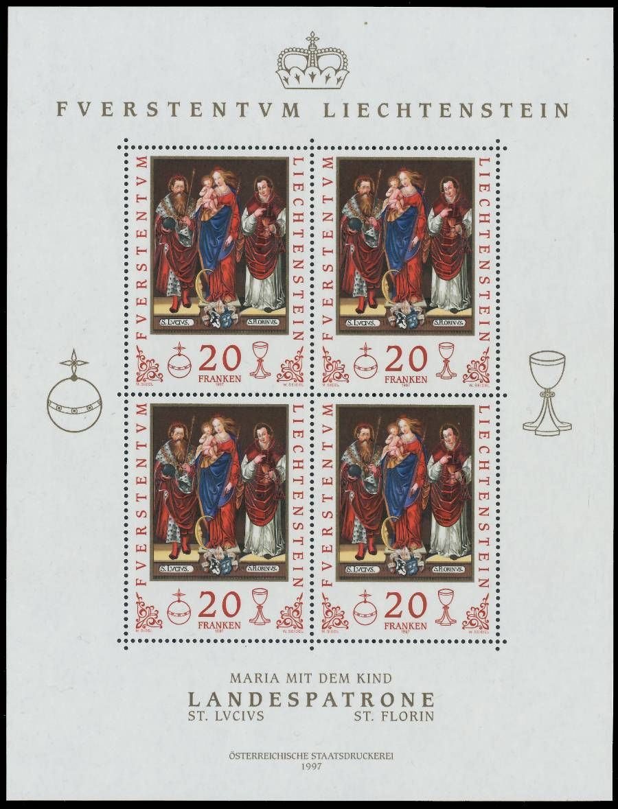 LIECHTENSTEIN 1997 Nr 1151 postfrisch KLEINBG 20 Fr. Wert Landespatrone im Kleinbogen 75.61€ incl. MwSt: Differenzbesteuert zzgl. Versandkosten Bestell-Nr.: 393BA2 Katalog-Nr: MICHEL (1151) Katalogpreis: 140 EUR Qualität: Normal Erhaltung: Postfrisch ** Einheit: Kleinbogen Bogenlage: Gummierung