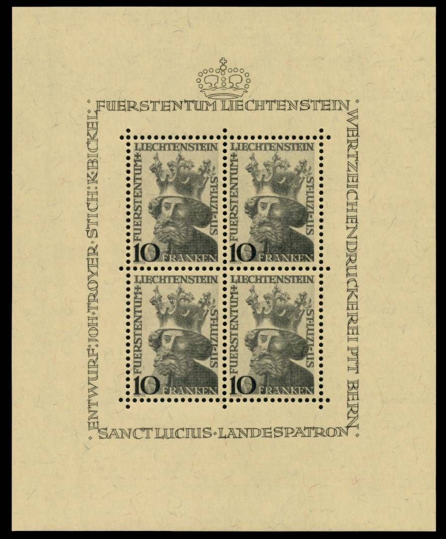 LIECHTENSTEIN BLOCK KLEINBOGEN Nr 247 postfrisch KLEINB 10 Fr. Freimarkenausgabe von 1946 im Kleinbogen 132.31€ incl. MwSt: Differenzbesteuert zzgl. Versandkosten Bestell-Nr.: 6A8BEA Katalog-Nr: MICHEL (247) Katalogpreis: 350 EUR Qualität: Normal Erhaltung: Postfrisch ** Einheit: Kleinbogen Bog