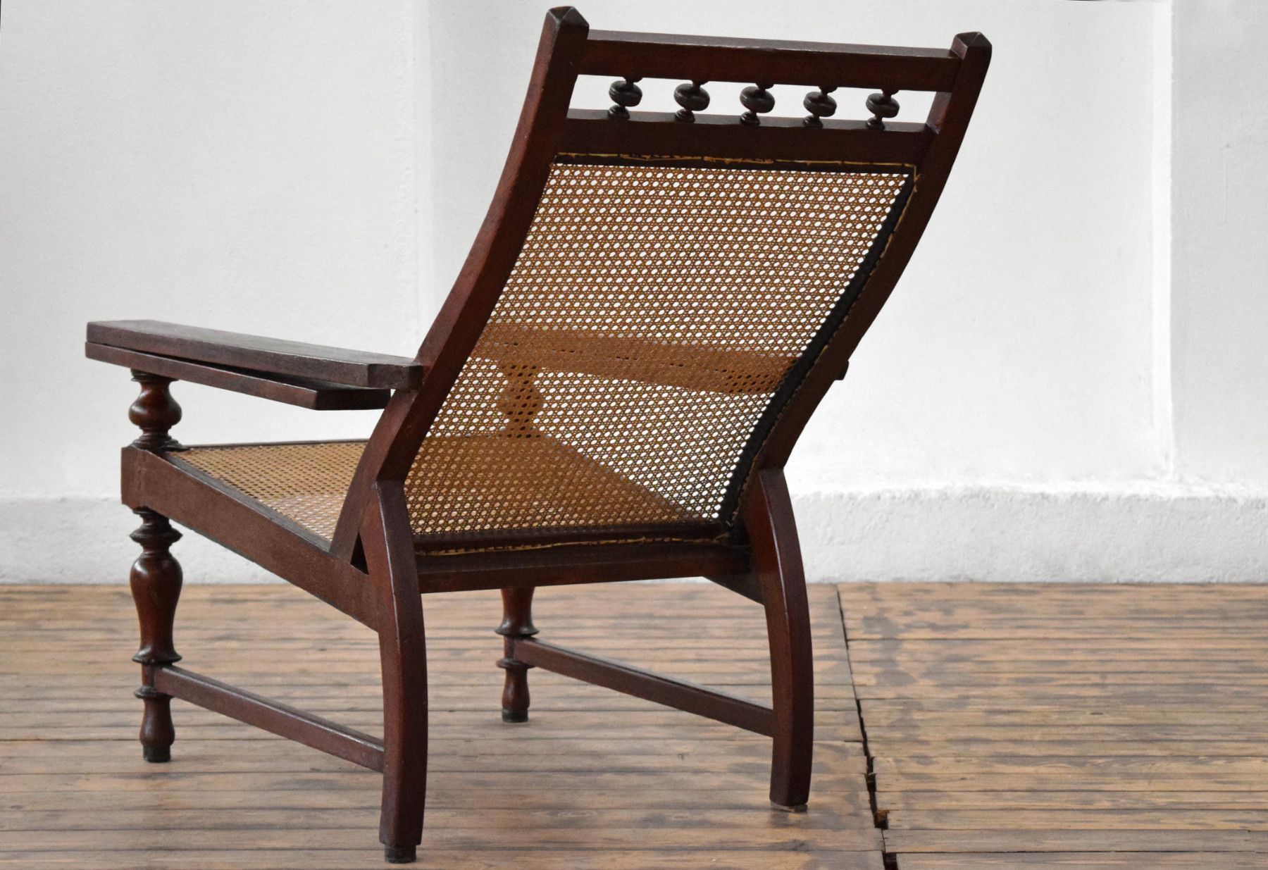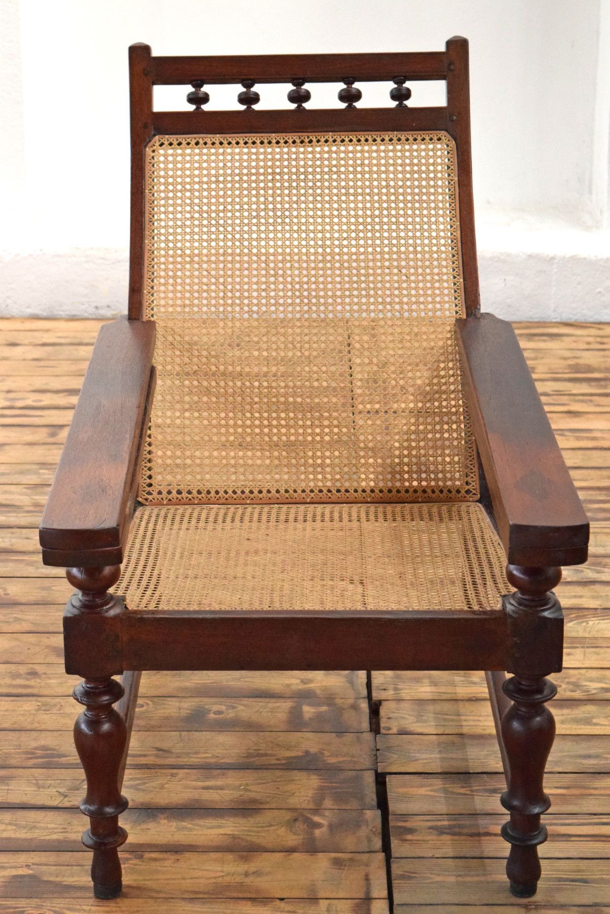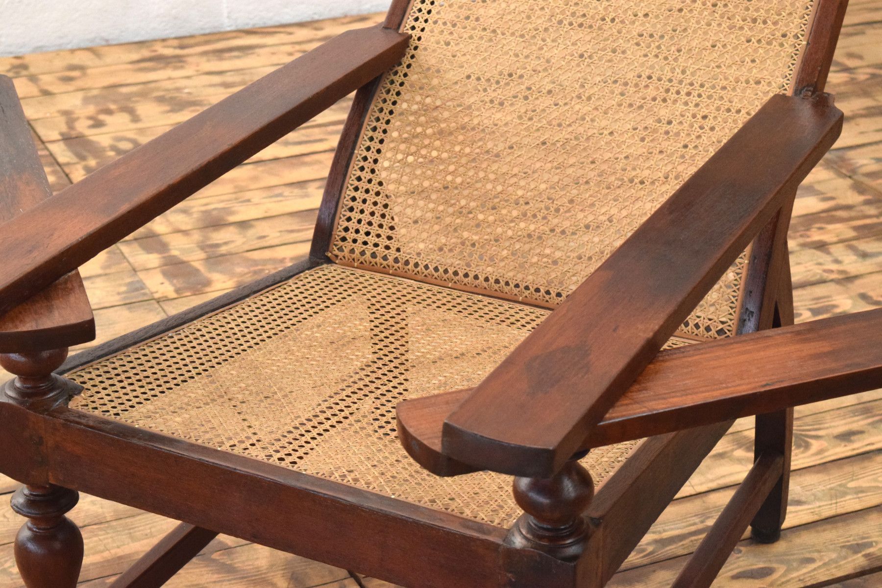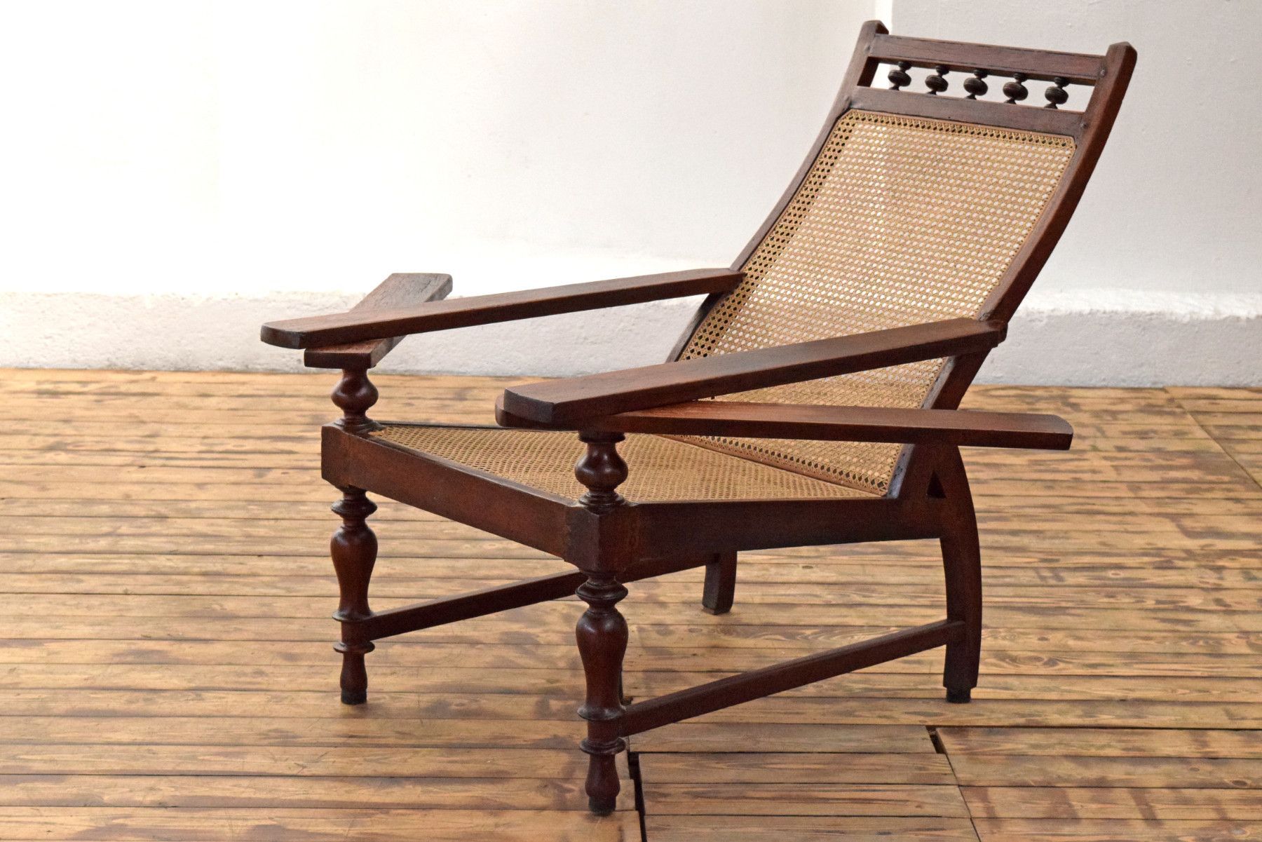 antiker Britisch- Kolonialer Liegestuhl (Planters Chair) Traggerüst aus massivem Teakholz Sitz- und Lehnenfläche: handgenüpftes Geflecht aus Peddigrohr gepflegtes Möbel, stabil, belastbar, schöner Vintage Zustand Sitzhöhe 43cm, Lehnenhöhe 95cm, Breite 64cm, Tiefe 120cm mit Schwenkauzug unter den Armlehnen Der Versand innerhalb Deutschlands ist kostenlos.Verkauf ohne Deko