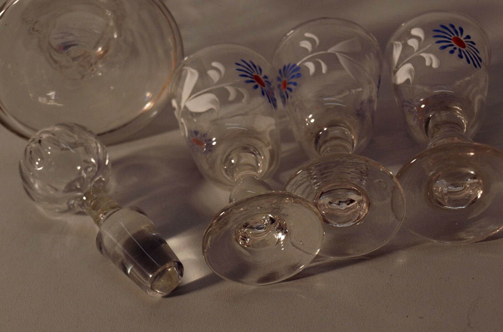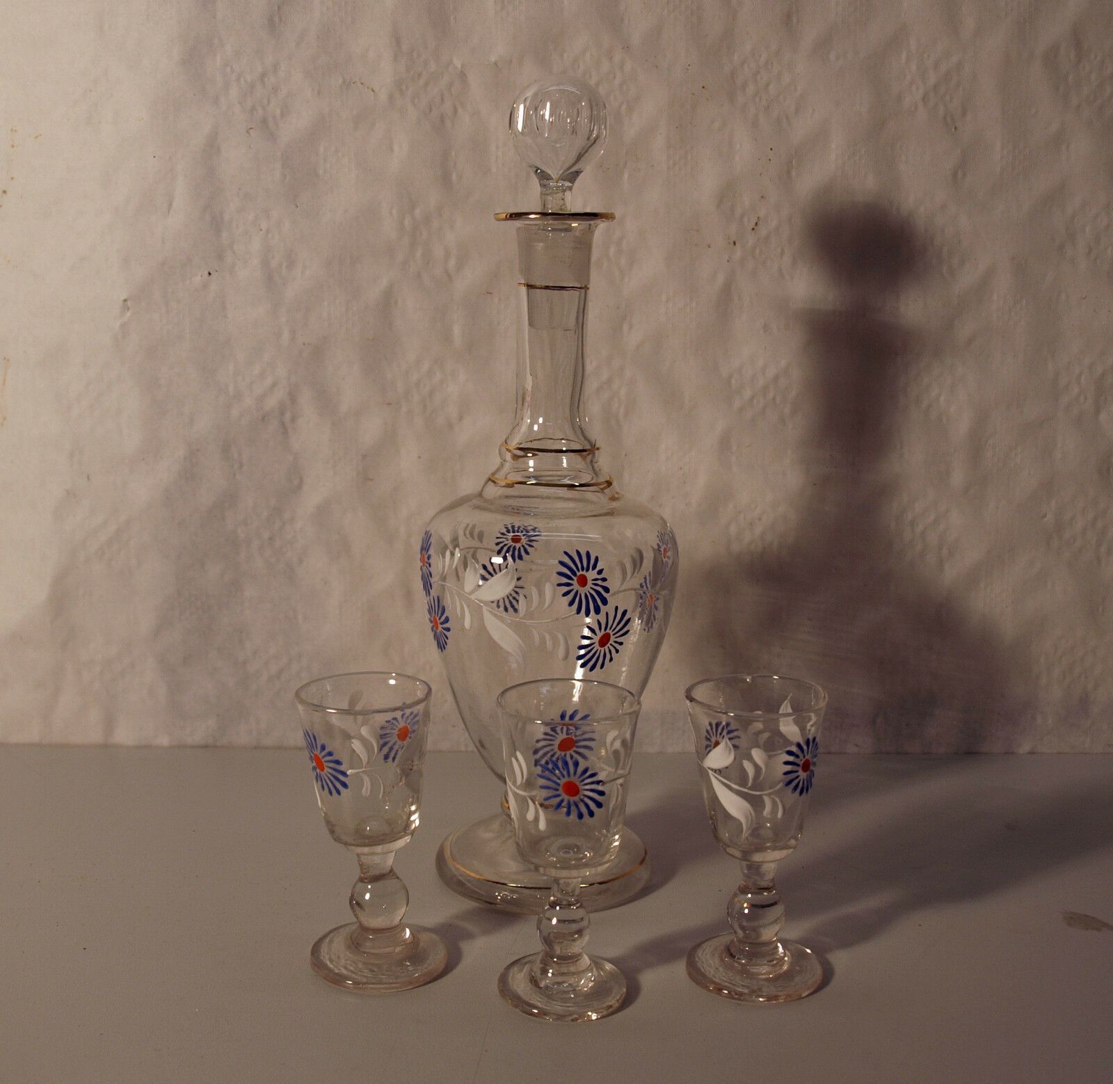 Likörset um 1820 (Biedermeier). Bestehend aus 1 Karaffe mit Stöpsel und 3 Gläsern. Alle handbemalt und mundgeblasen mit Abriss. Maße: Höhe Karaffe 25, Höhe Gläser 8 cm. Antikes am Deich - Inh: Oliver Kipp-Trense G M T Sprache erkennen Afrikaans Albanisch Arabisch Armenisch Aserbaidschanisch Baskisch