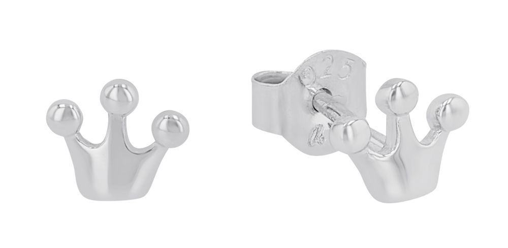 Mädchen- Ohrstecker aus glänzendem 925er Sterling Silber. Die Ohrringe haben die Form von Kronen. Anlaufgeschützt durch hochwertige Rhodiumbeschichtung.