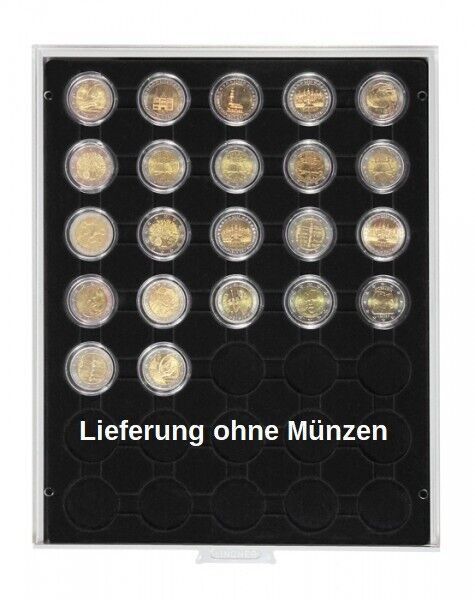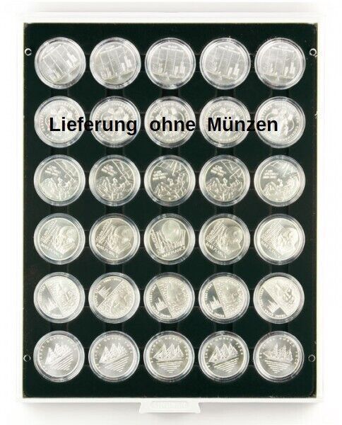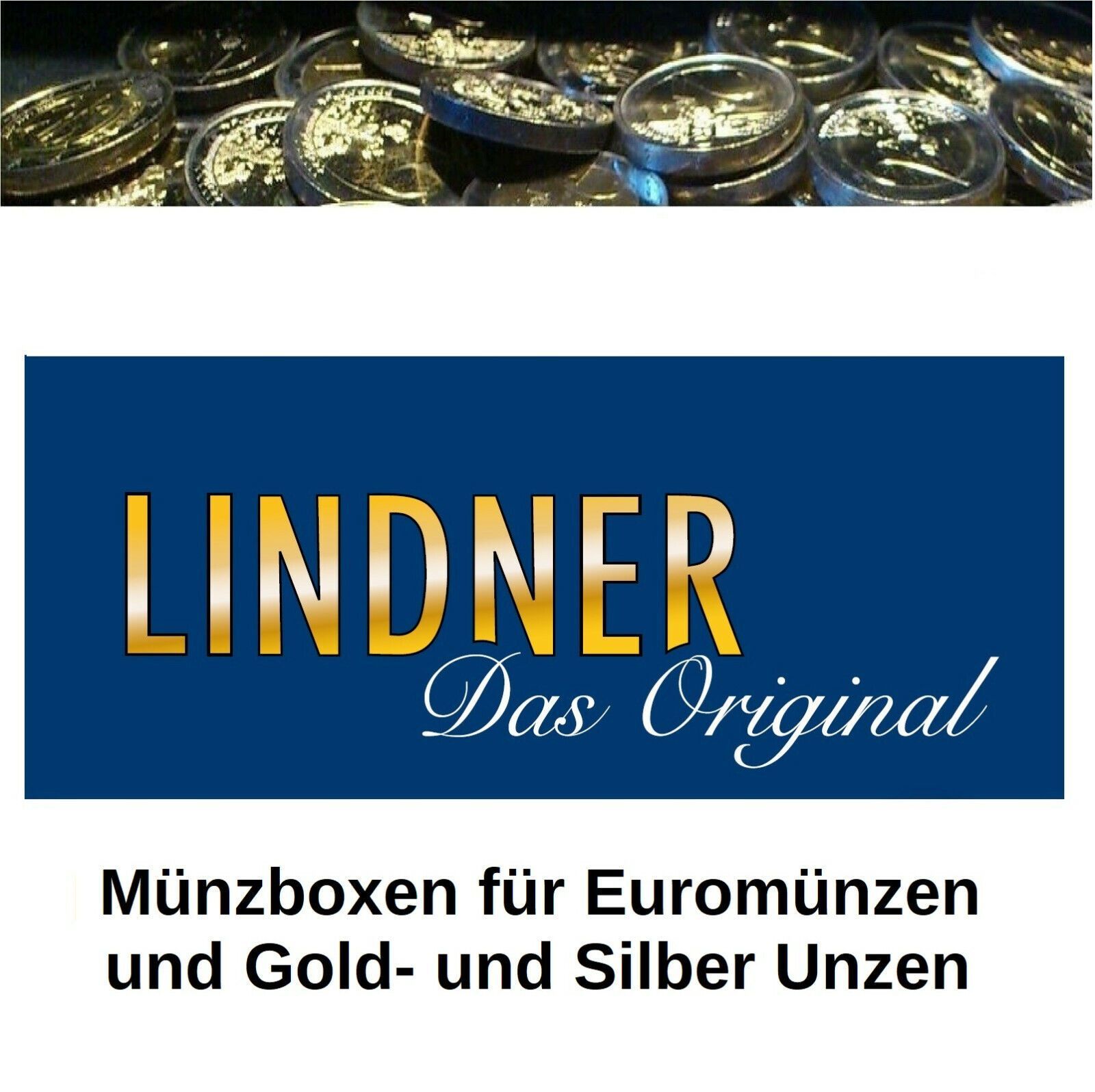 LINDNER Münzboxen Modell 2537C mit 30 runden Vertiefungen a 37,5 mm (äDm) für zum Bsp orig. verkapselte deutsche 10 und 20 Euro Silbermünzen in Spiegelglanz Modell 2530M mit 35 runden Vertiefungen a 32 mm (äDm) für zum Bsp 2 Euro Gedenk- und Kursmünzen in Kapseln Münzbox mit hellgrauer Schublade und