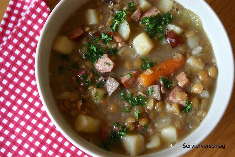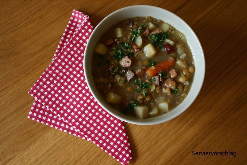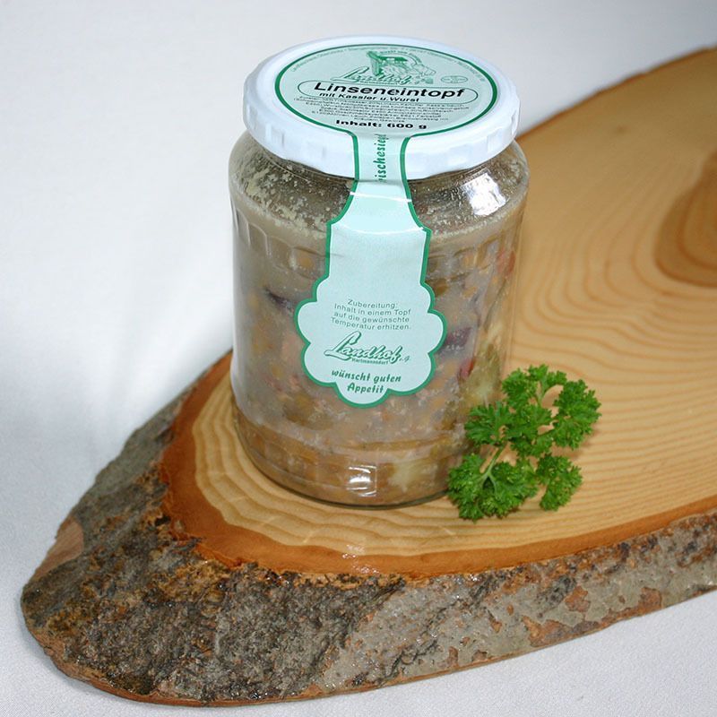 Linseneintopf mit Kassler und Wurst, 600 g netto (10,00 € kg) Zutaten: 35% Trinkwasser, 20% Linsen, Kartoffeln, Kasslerbauch (Schweinefleisch, Nitritpökelsalz, Jod, Kochsalz, Konservierungsstoff E250), Wurstbrät (30% Schweinefleisch, 30% Rindfleisch, Speck, Stabilisator E450, Antioxidationsmitt... Mehr