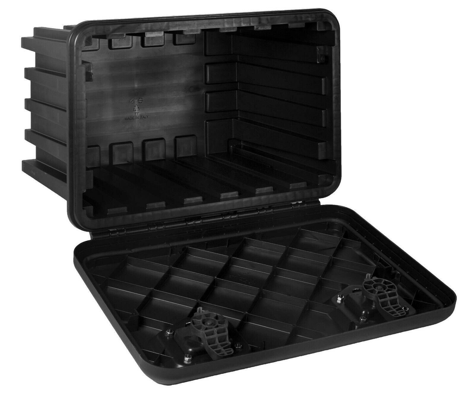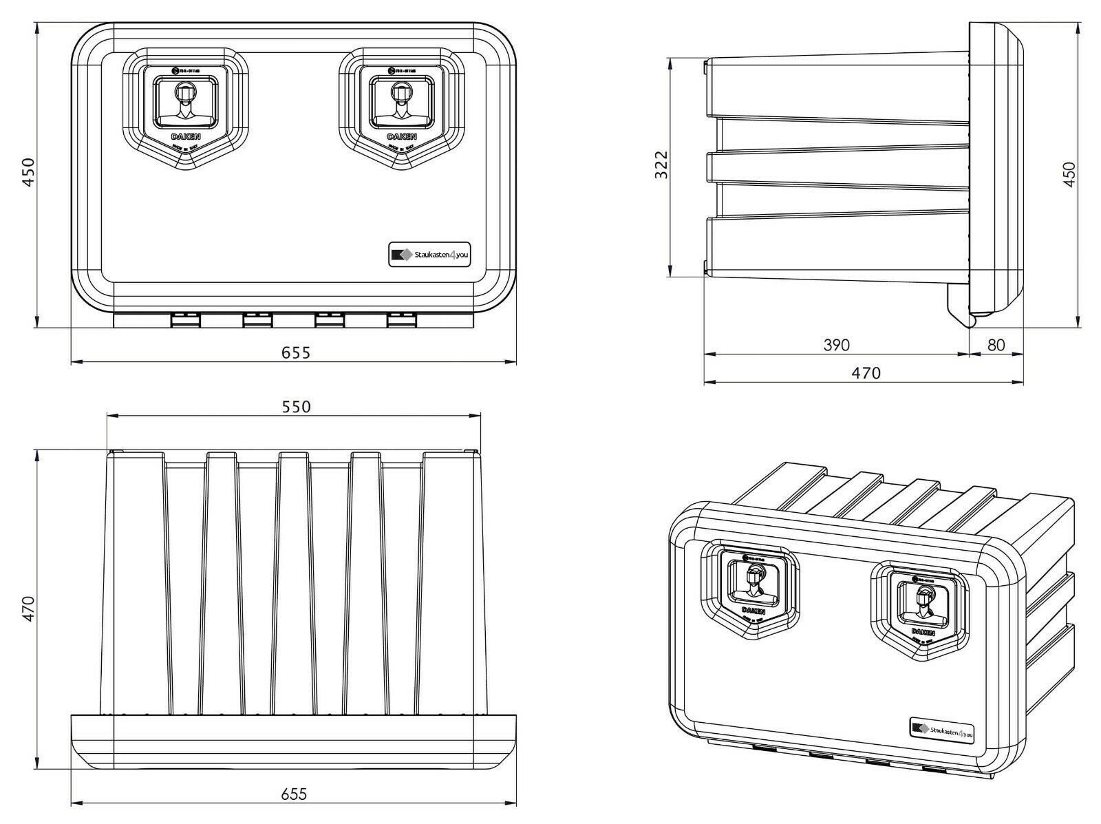 LKW Staukasten, Staubox Werkzeugkasten aus Kunststoff - B 655 x H 450 x T 470 mm, inkl. Halterung - Daken ARKA 210600V Der Werkzeugkasten besteht aus Polypropylen erster Wahl und wird im Spritzgussverfahren hergestellt. Werkzeugkasten mit geringem Eigengewicht, nur 7,6 Kg, mit Halterung 9 Kg 2 einge