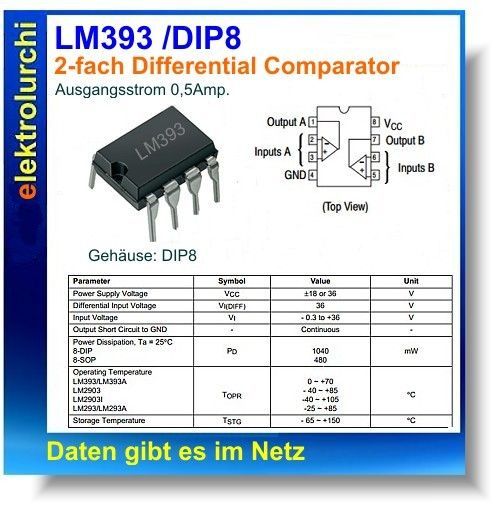 Sie bieten hier auf folgenden Artikel 1 Stück LM393N - 2-fach Differenz Comparator LM 393 N, DIP8, Motorola, Gehäuse:DIP8 Hersteller: Motorola