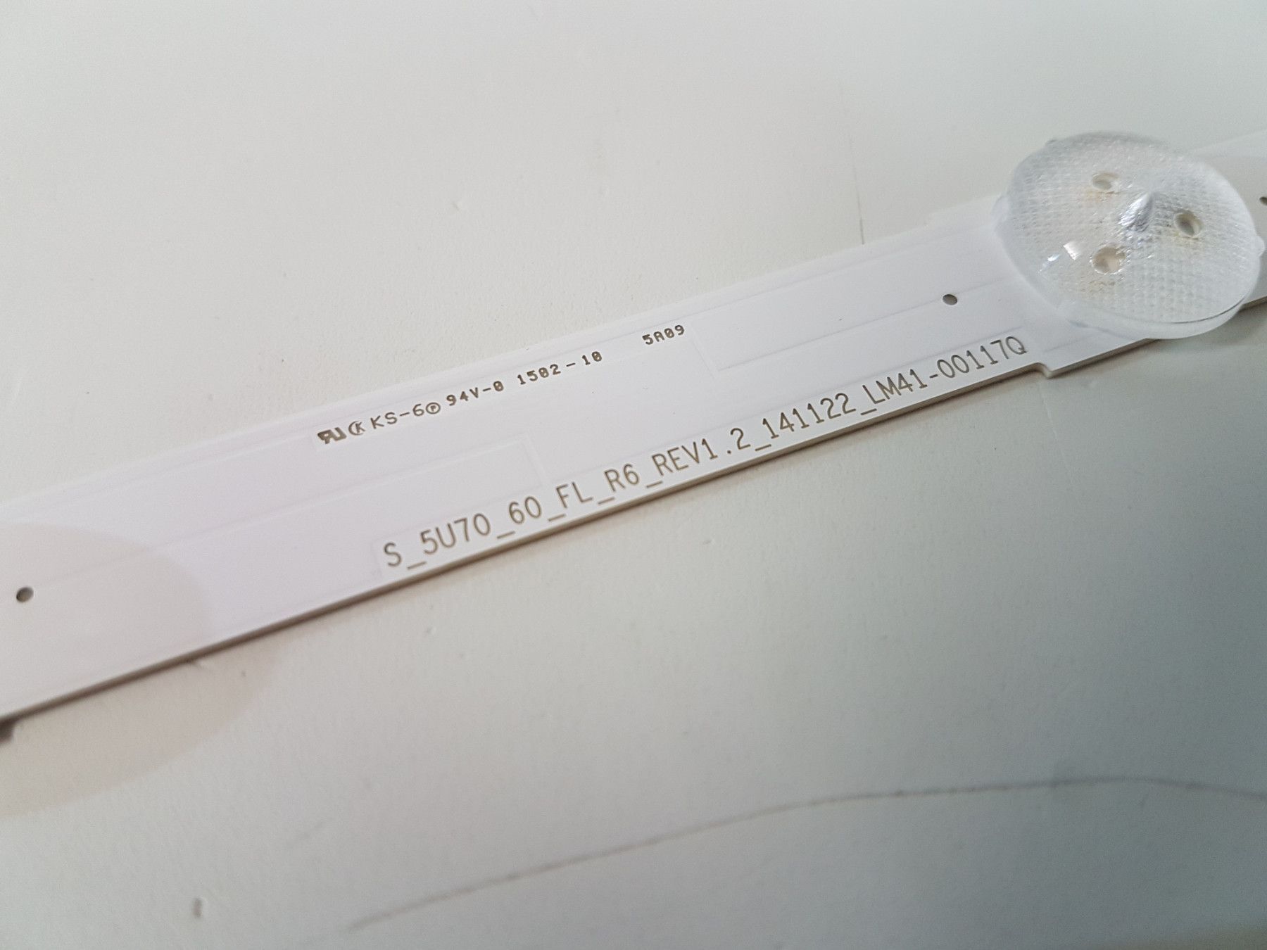 gebrauchte LED Backlight Strip Leiste voll funktionstüchtig Typ: Samsung S_5U70_60_FL_R6_REV1.2_141122_LM41-00117Q weitere Bezeichnungen lauten: Länge: 530mm Breite: 15mm Anzahl LEDs: 6 Steckverbinder: 2 Polig passend zum Display: CY-GJ060HGSV1H passend zu Samsung : UE60JU6450UXZG Regal