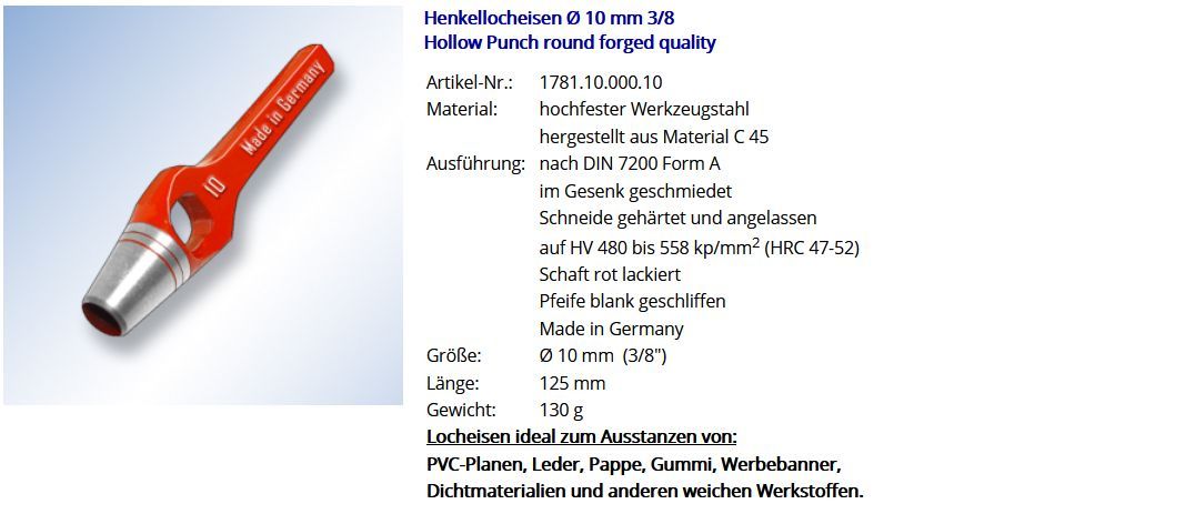 Henkellocheisen Ø 10 mm 3 8 Hollow Punch round forged quality Artikel-Nr.: 1781.10.01000000 Material: hochfester Werkzeugstahl hergestellt aus Material C 45 Ausführung: nach DIN 7200 Form A im Gesenk geschmiedet Schneide gehärtet und angelassen auf HV 480 bis 558 kp mm 2 (HRC 47-52) Schaft ro