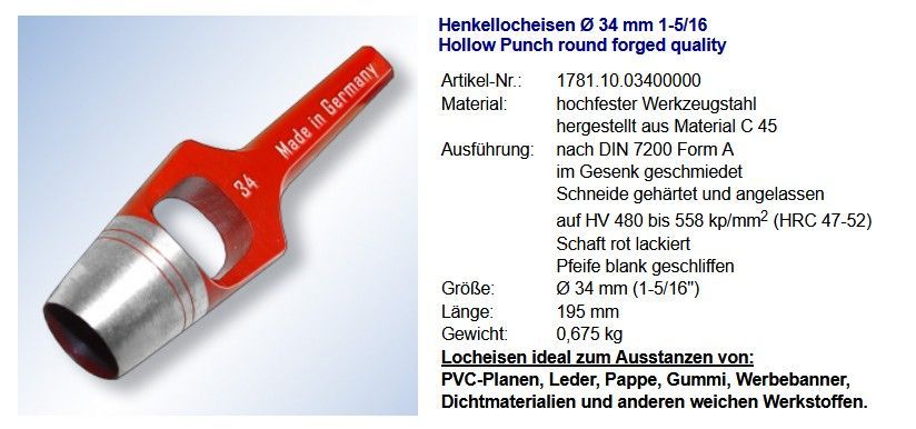 Henkellocheisen Ø 34 mm 1-5 16 Hollow Punch round forged quality Artikel-Nr.: 1781.10.03400000 Material: hochfester Werkzeugstahl hergestellt aus Material C 45 Ausführung: nach DIN 7200 Form A im Gesenk geschmiedet Schneide gehärtet und angelassen auf HV 480 bis 558 kp mm 2 (HRC 47-52) Schaft