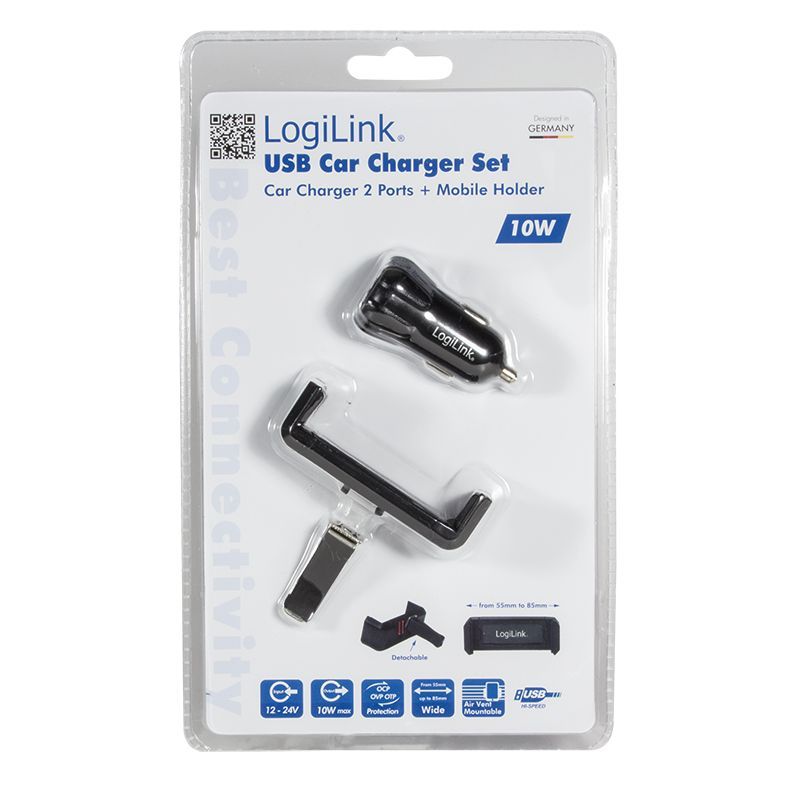 LogiLink LogiLink USB Kfz Ladegerät + Smatphone Halterung im Set schwarz (2er Blister)